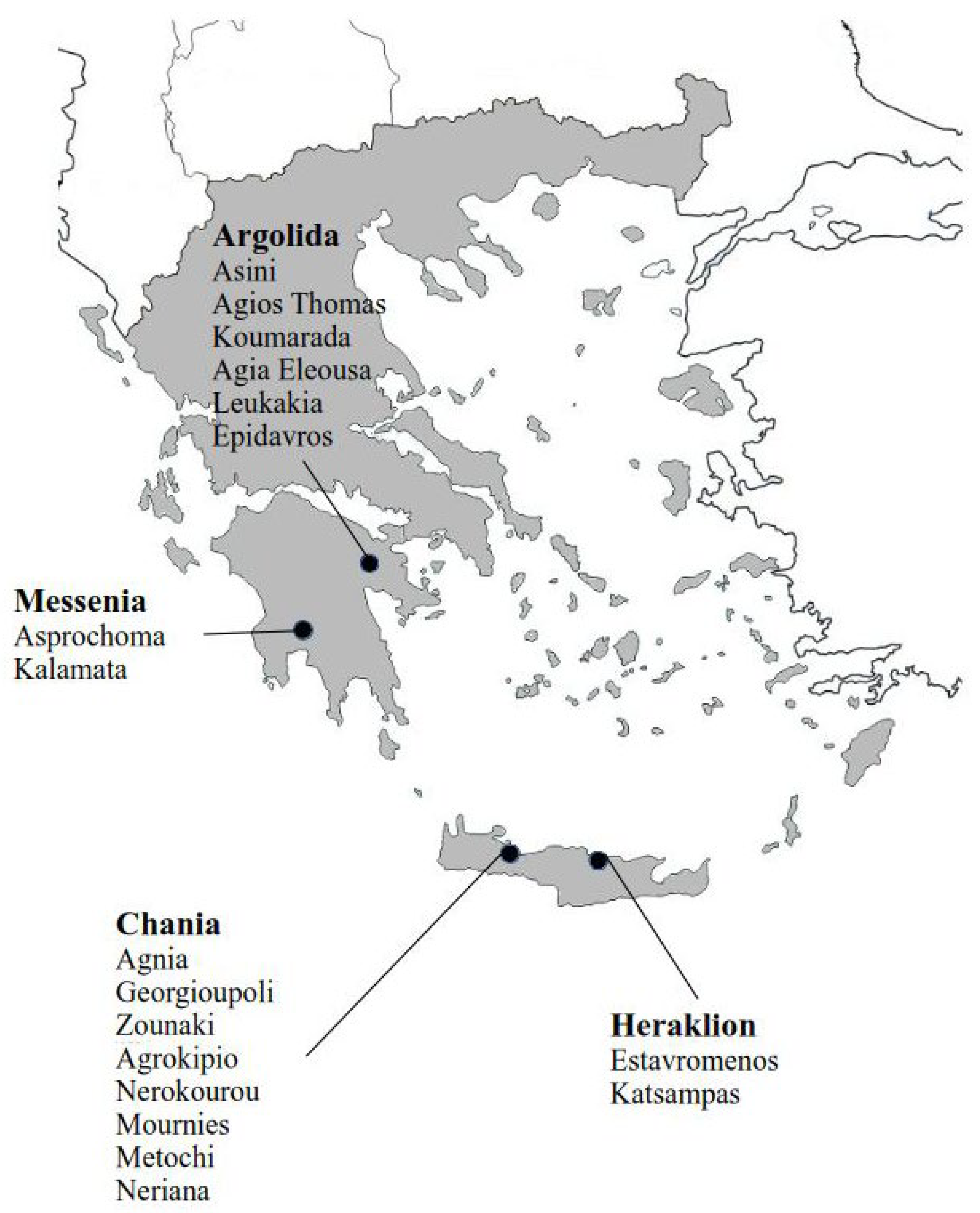 Figure 1. Collection sites of Aphis spiraecola samples in prefectures of Greece: Argolida (N = 11), Messinia (N = 7), Heraklion (N = 12), and Chania (N = 42).