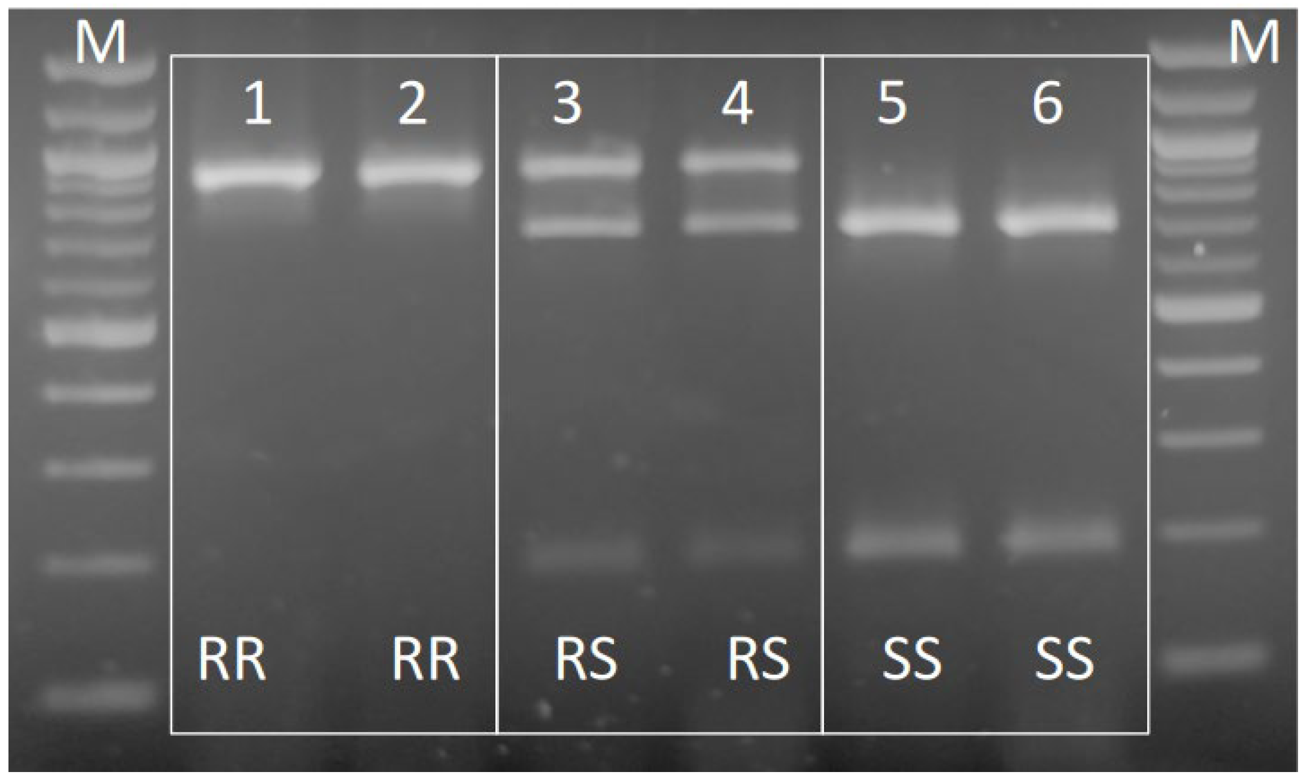 Figure 2. PCR-RFLP diagnostic assay of the S431F resistance mutation in A. spiraecola after SspI enzymatic digestion. Lanes 1, 2: homozygousr individuals (RR); lanes 3, 4: heterozygous individuals (SR); lanes 5, 6: homozygous susceptible individuals (SS). M: molecular weight marker (Quick-Load 100 bp DNA Ladder, New English Biolabs, Frankfurt, Germany).