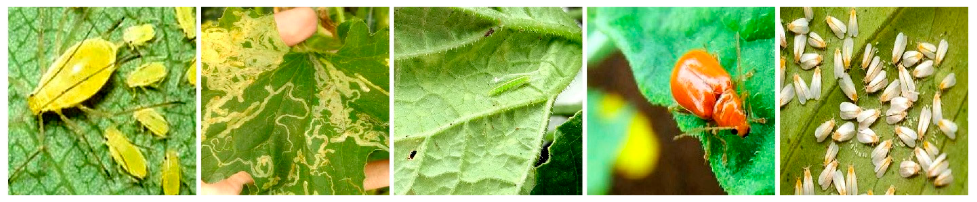 The dataset used in this study was the Melon Cantaloupe Pest dataset from the Robotflow website, which contained complex images of five common cantaloupe leaf pests under natural conditions. The five pests were Aphids, Leafminers, Moths, Red-Melon Beetles, and Whiteflies. Due to the special habits of leafminers, the dataset images were not of the pest itself, but of the zigzagging white trails it left on the leaves. An example diagram of the five categories of pests is shown in Figure 1.
