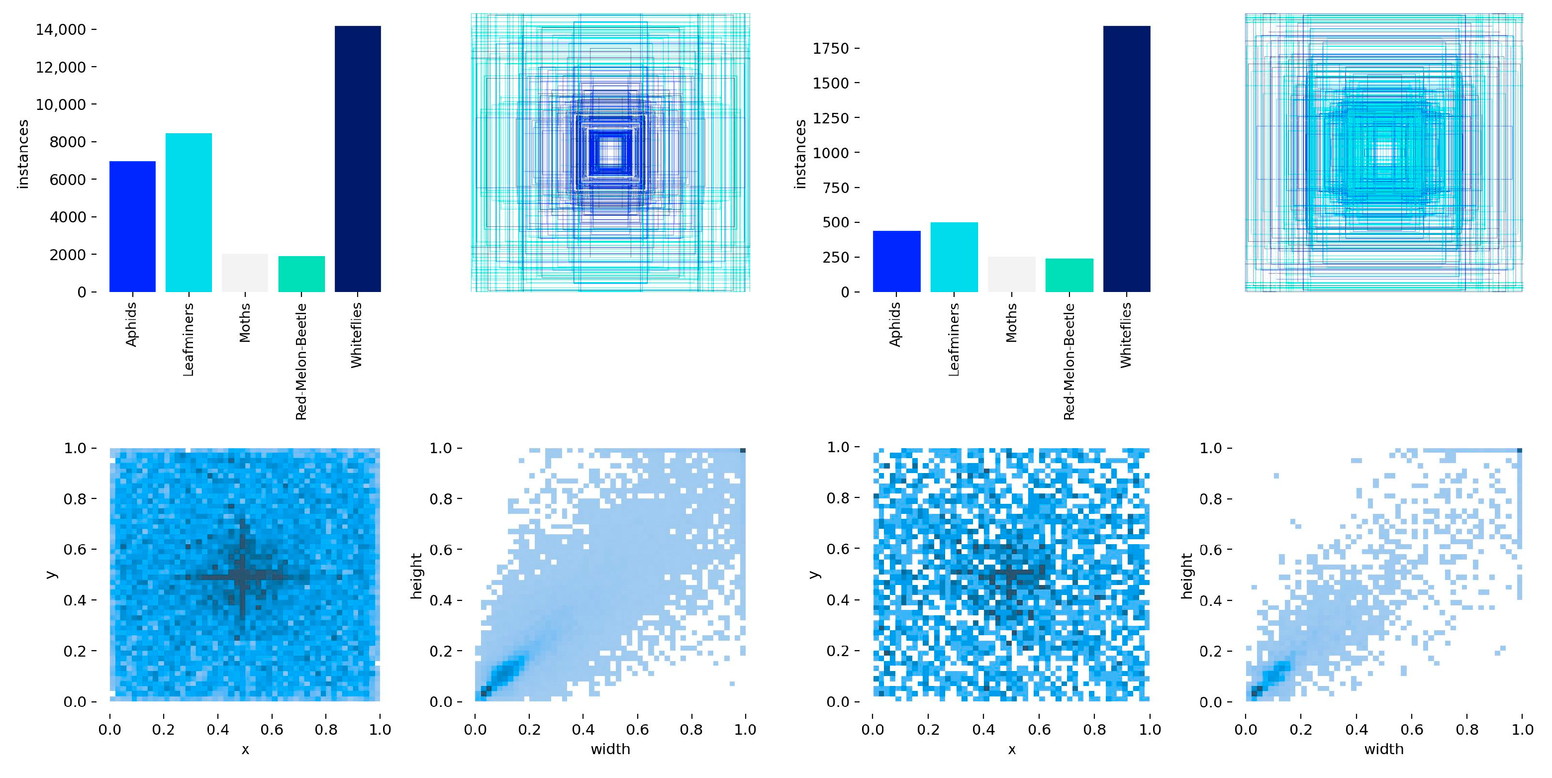 In the data preprocessing stage, samples with serious ambiguities, distortions, and missing labeling information were first removed to ensure the quality of the dataset. Then in order to avoid data leakage (Images in the expanded part of the dataset that were similar to those in the training set were partitioned into the validation set), the pest images of each category were first divided into the training set, validation set, and test set in the ratio of 8:1:1. To mitigate classifier bias and enhance dataset diversity, data augmentation techniques involving horizontal flipping and vertical flipping (each applied with a 50% probability) were employed to augment the training images for aphids and leafminers, which had relatively smaller datasets. The aphids training dataset expanded from 952 to 1904 images, while the leafminers dataset grew from 1100 to 2200 images. After the above processing, the final constructed dataset had a total of 11,949 images, including 9967 images in the training set, 988 images in the validation set, and 994 images in the test set. Examples of some of the excluded problem images are shown in Figure 2. The label information for the training and validation sets is shown in Figure 3. The labels and number of images for each type of data were shown in Table 1.