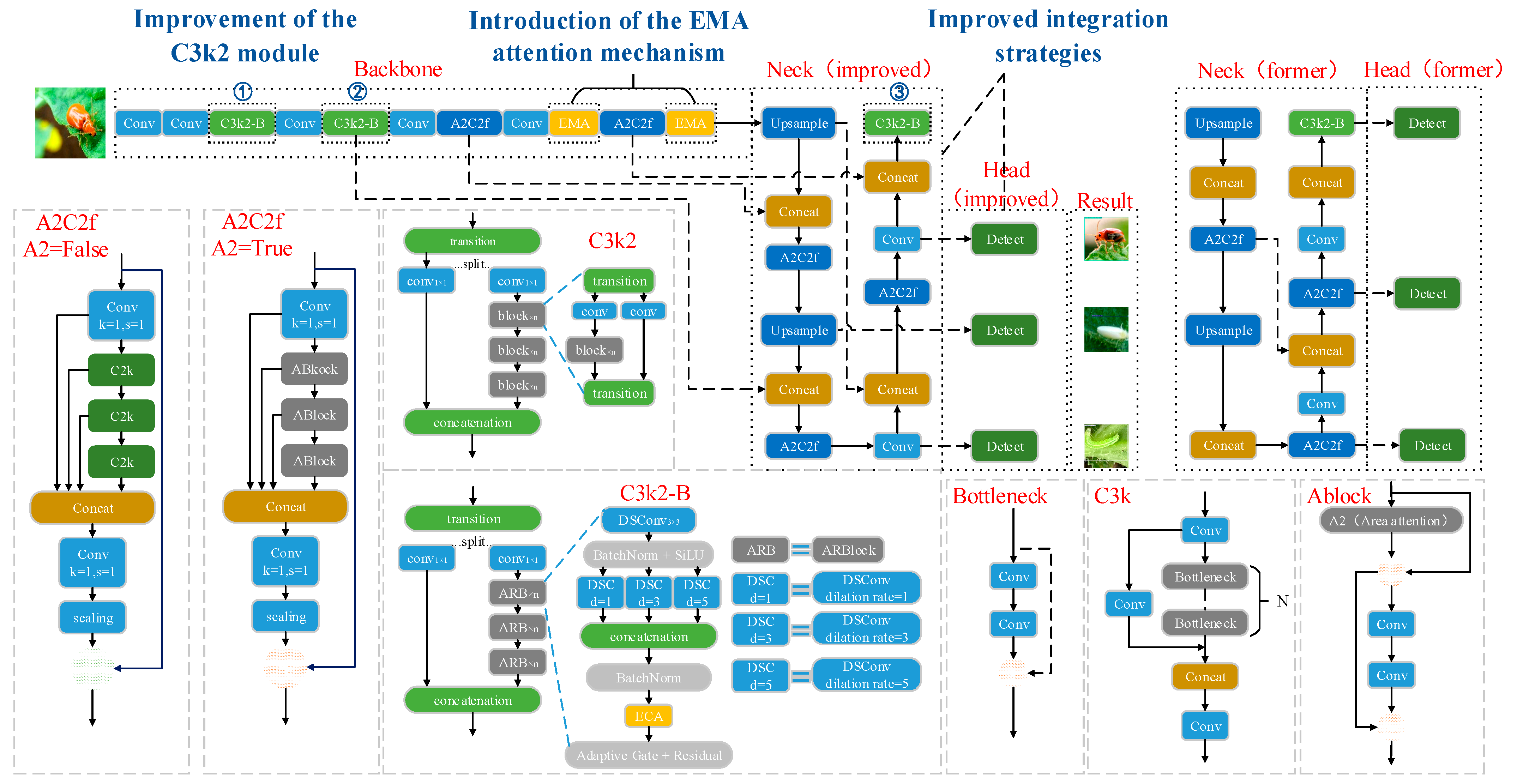 In order to enhance the detection performance of YOLOv12 in the cantaloupe leaf pest task, four improvements were proposed in this study: (1) Add the EMA attention mechanism module after the Conv and A2C2f layers at the end of the backbone network, respectively, to enhance the model’s ability to capture features of small targets; (2) Change the fusion strategy of the Concat layer and the Detect layer of the detection head in the Neck network Neck to construct a smoother feature pyramid, enhance the ability of the model to capture features of pests with different scales, and improve the detection accuracy; (3) Introduce the WIoU v3 loss function to reduce the harmful gradient of low-quality samples and focus on the anchor frames of ordinary quality, thus improving the overall performance of the model; (4) Improve the C3k2 module to enhance the detection accuracy while keeping the model lightweight and reducing the computational and parametric quantities of the model. The structure of the improved YOLOv12 network model is shown in Figure 4.