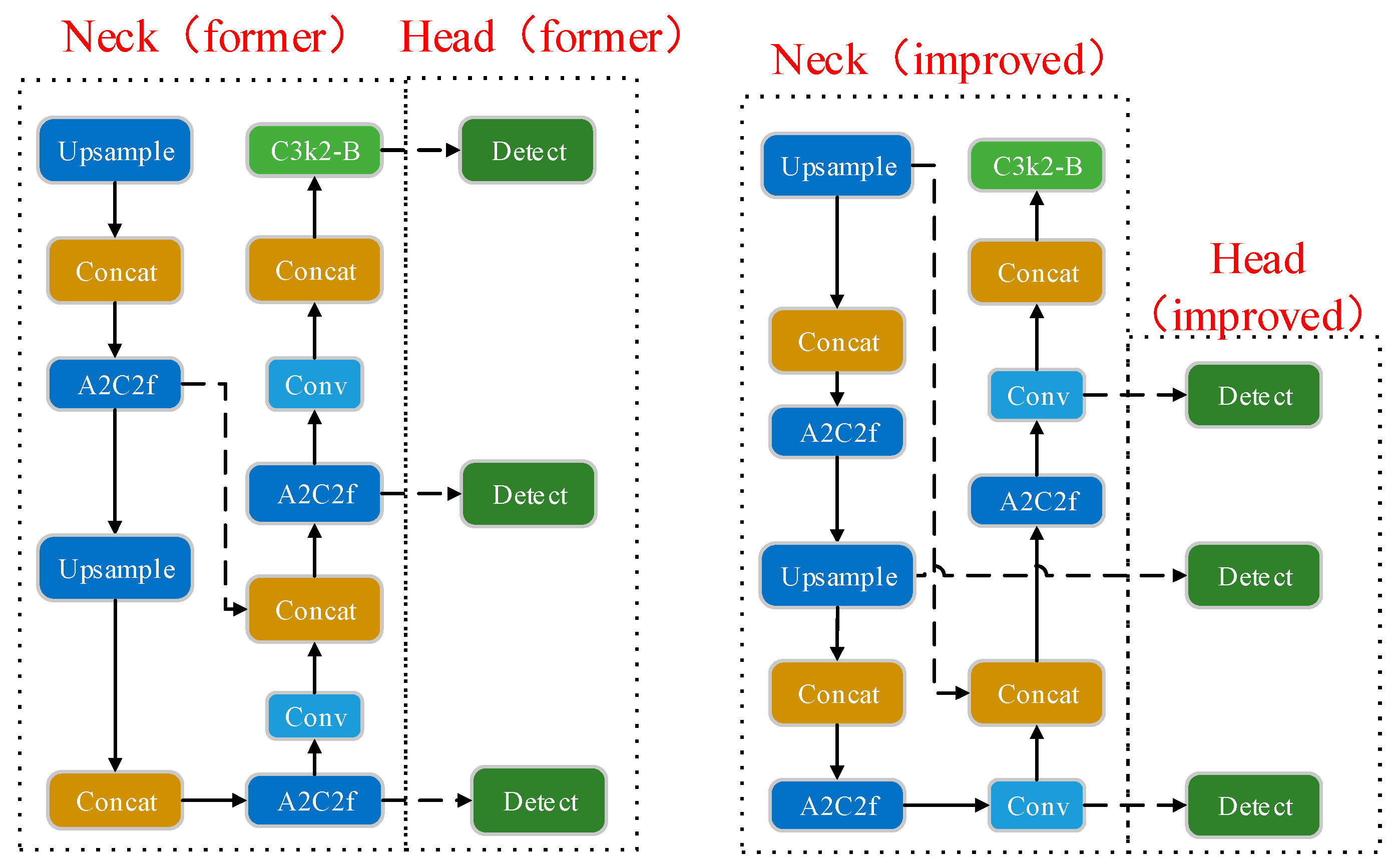 In the Neck network of YOLOv12, the Concat module at layer 17 combines features from the Conv layer above it and the A2C2f module at layer 12. In the Head network, the Detect layer fuses features from the 15-layer A2C2f, 18-layer A2C2f, and 21-layer C3k2 modules, respectively. In the original architecture, the Concat layer of the Neck network and the Detect layer of the Head network receive inputs at relatively deep positions. This arrangement tends to cause the gradual attenuation of spatial details in shallow features rich in positional and contextual information after undergoing multiple convolutions and feature transformations. Consequently, the model’s detection capability for small and edge-bound targets is compromised. Not only that, the layers of feature fusion are deeper, the semantic and spatial information at different scales cannot be fully interacted with at an earlier stage, and shallow features play a limited role, which is not conducive to the model’s effectiveness in detecting multi-scale targets. To address the above problems, this study advances the fusion layer between the Concat layer in the Neck network and the Detect layer in the Head network, enabling the shallow features processed by the EMA attention mechanism to participate in the fusion earlier and more directly within the network. This retains more spatial and texture details and improves the utilization of shallow spatial detail information, and the features of different scales can achieve full interaction at an earlier stage. The improvement of the above-optimized fusion strategy enhances the network’s robustness to multi-scale targets and improves the model’s ability to detect small and dense targets. The structure of the Neck and Head network before and after the improvement is shown in Figure 6.