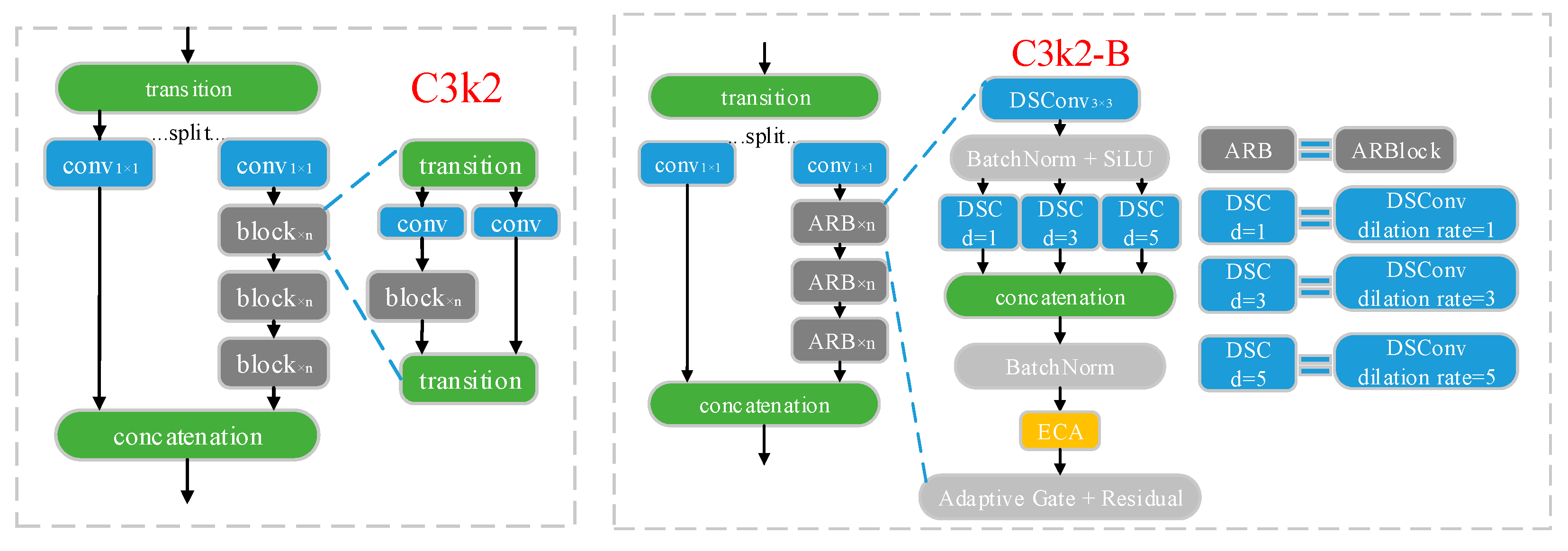 • The C3k2-B module is designed by introducing an adaptive residual block (ARBlock) to replace the original block module in the C3k2 architecture. This transformation creates a lightweight and efficient feature extraction module, enabling the model to capture features across different receptive fields. Furthermore, the fusion layer between the Neck and Head networks is modified to enhance the model’s utilization of shallow-layer features.