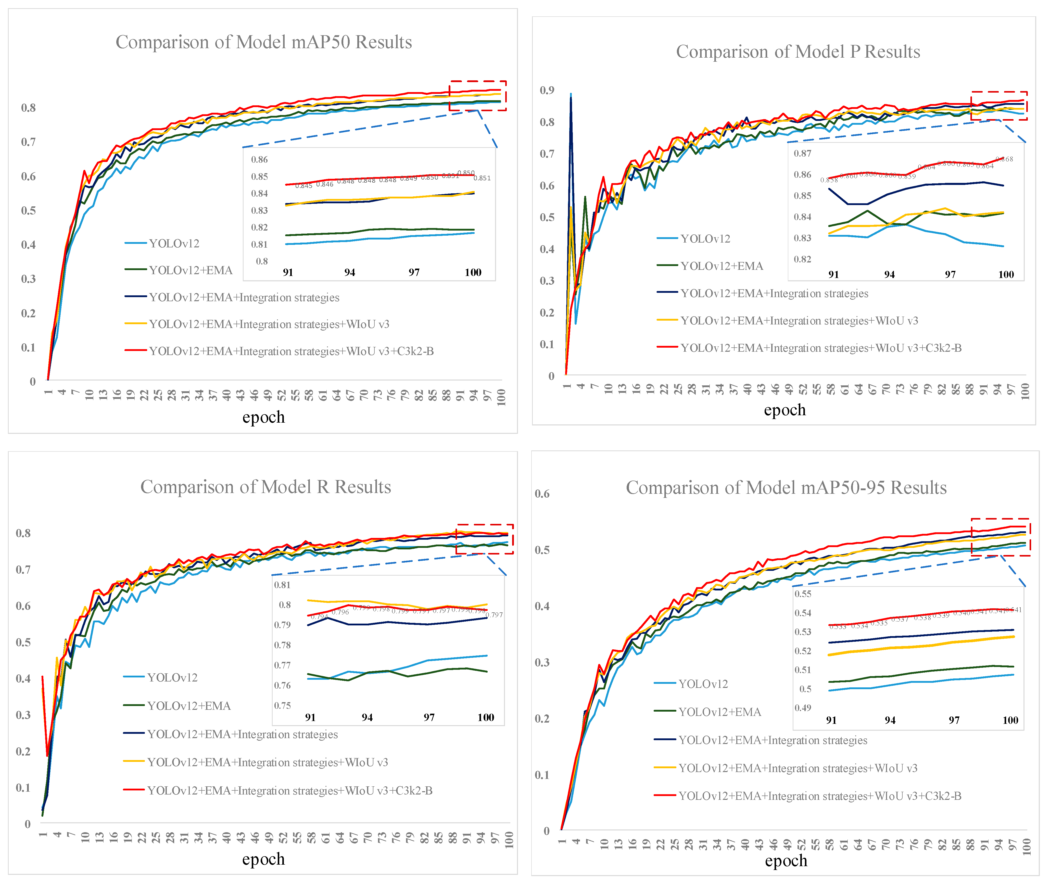 RT-DETR (Real-Time Detection Transformer) [34] is a relatively new model in the DETR family of algorithms, which is an innovative model architecture that combines the Transformer and real-time target detection. It aims to solve the problem of the trade-off between speed and accuracy in the existing target detection models by introducing an efficient Transformer module and an optimized detection head, which improves the real-time performance and accuracy of the model. Compared to the RT-DETR model, the improved YOLOv12 model exhibits an R that is 0.48% lower than the former. However, it outperforms the RT-DETR model by 2.51, 2.08, 3.27, and 1.02 percentage points in the four metrics of mAP50, P, mAP50-95, and F1, respectively. Additionally, it features a lower number of parameters and computational complexity. Therefore, in a comprehensive view, compared with other models, the model proposed in this paper achieves improved detection accuracy while maintaining lower computational and parametric quantities, and exhibits superior lightweighting and detection performance.