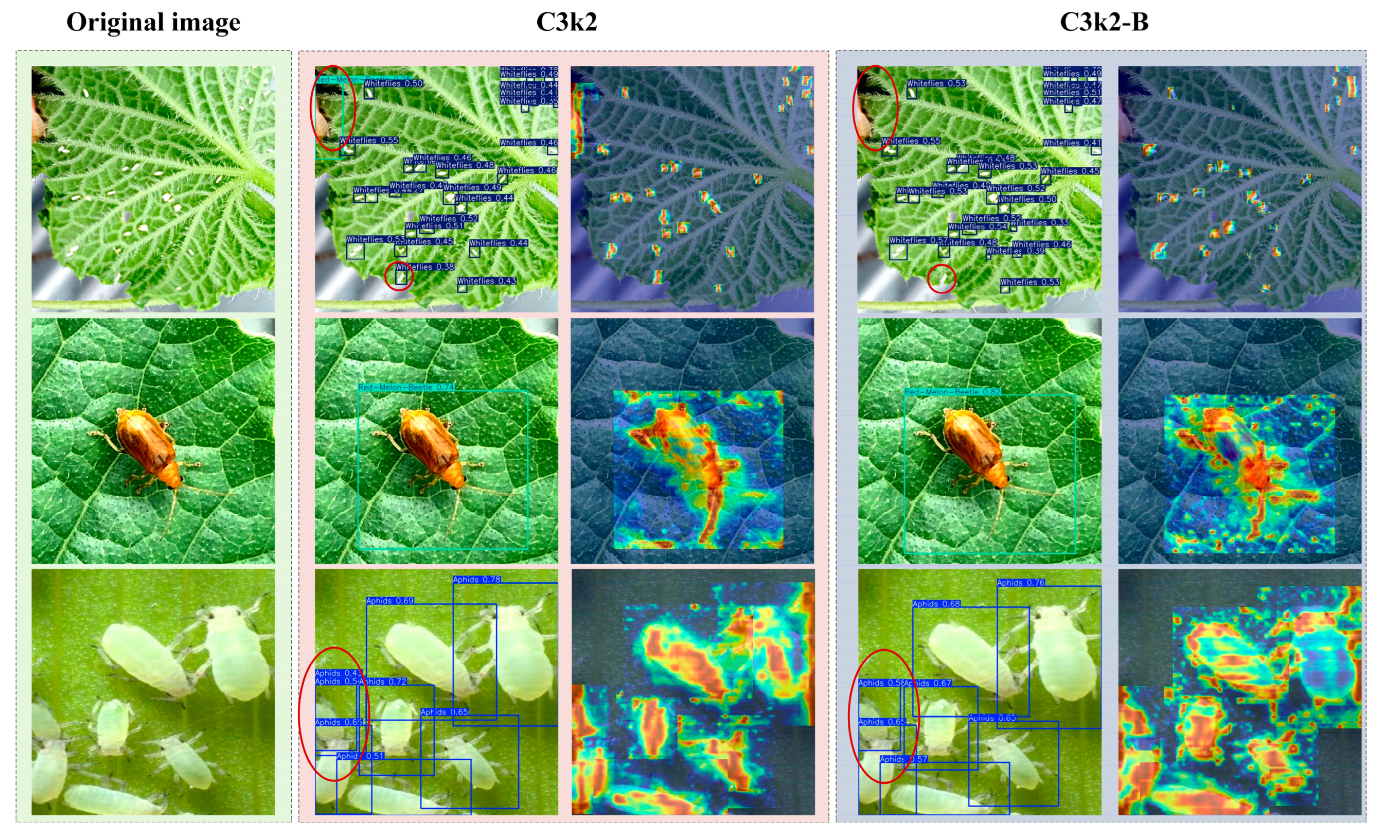 The 11th, 14th, 17th, and 20th layers of the model were selected to be indexed to draw the heat maps, and the detection results and heat maps are shown in Figure 10. From the detection results, compared with the C3k2 module, the introduction of the C3k2-B module improved the detection of pests at different scales to a certain extent. At the same time, the module improved the problems of misdetection and duplicate frames (marked by the red circle in the Figure 10). From the heat maps, after the introduction of the C3k2-B module, the pest contours are more obvious, and the model is more capable of capturing detailed features such as antennae and legs. In addition, the introduction of the C3k2-B module decreases both the number of parameters and the computational effort of the model, achieving an FPS (frames per second) of 70.92 on the test set, which is only about 0.5 lower than the 71.43 of the C3k2 model. The above results show that the C3k2-B module better maintains the lightweight nature of the model while improving the model detection capability.