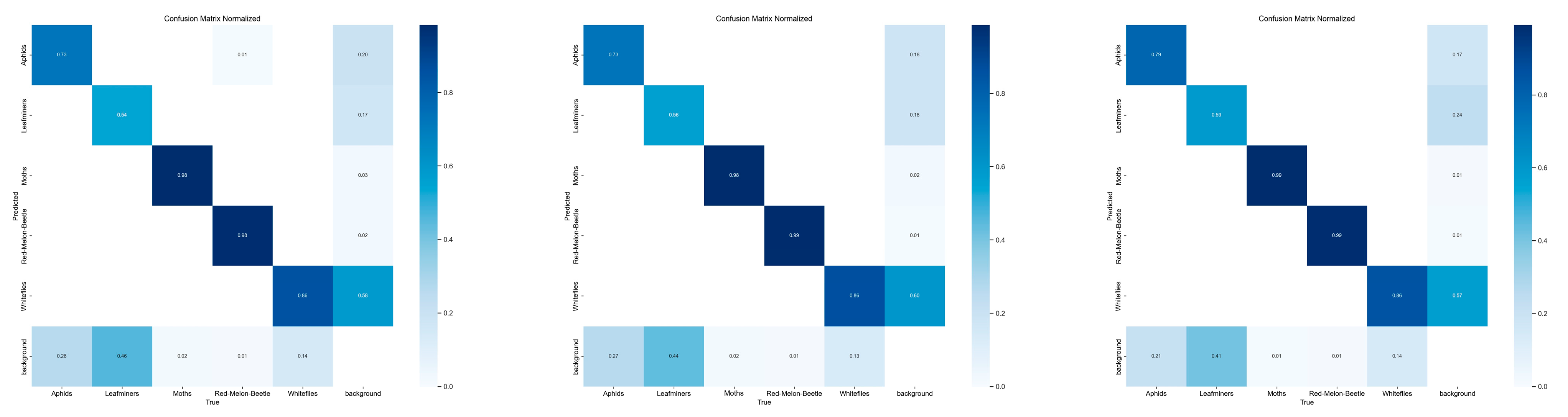 Figure 11. From left to right: confusion matrices for YOLOv12, YOLOv11, and the improved YOLOv12.