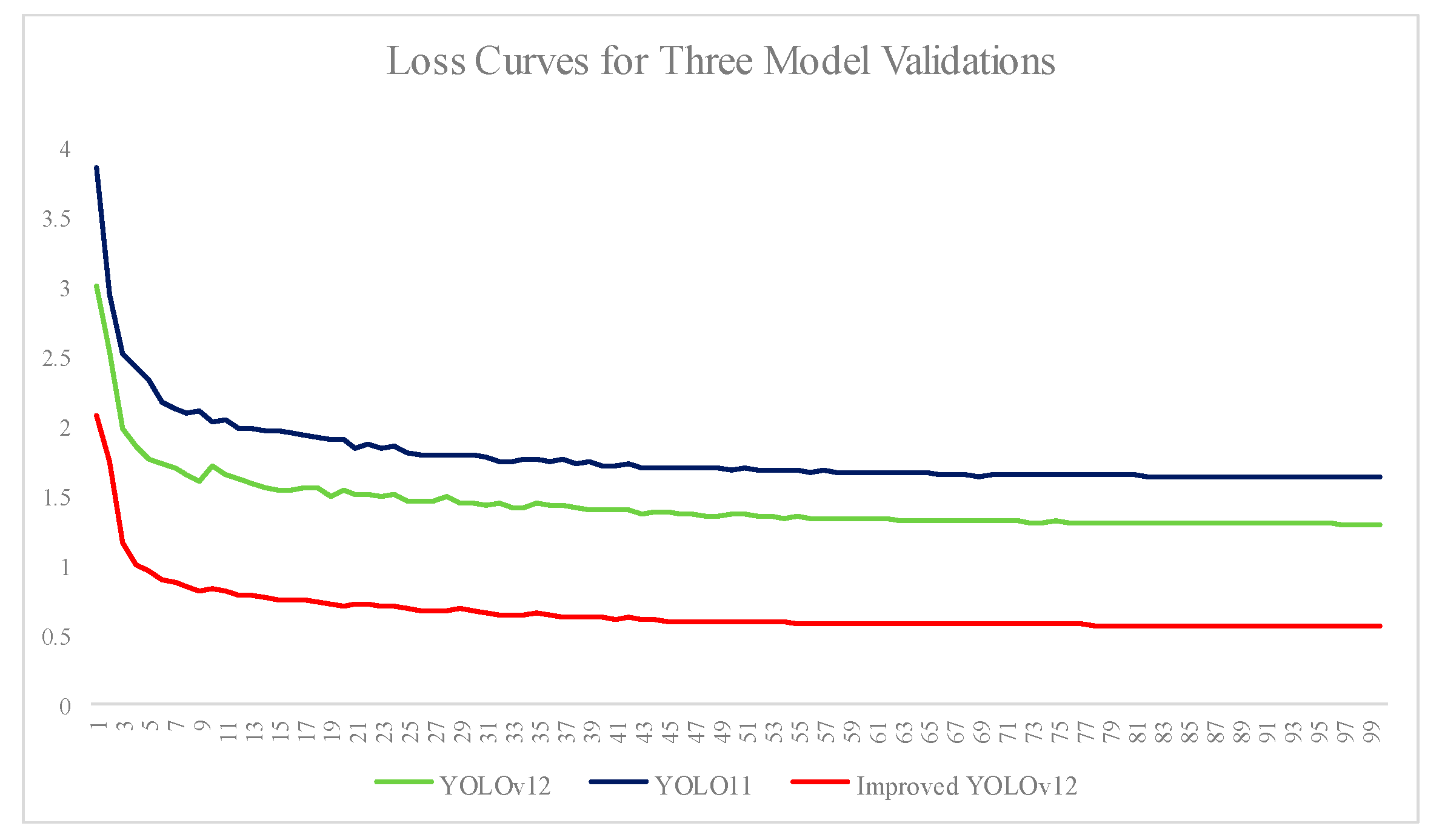 Figure 12 shows the validation loss curves for YOLOv12, the suboptimal model YOLOv11, and the improved YOLOv12. As shown in the Figure, the loss of all three models gradually decreases with increasing training iterations, eventually converging to a stable value. Notably, the improved YOLOv12 model converges to a lower value.
