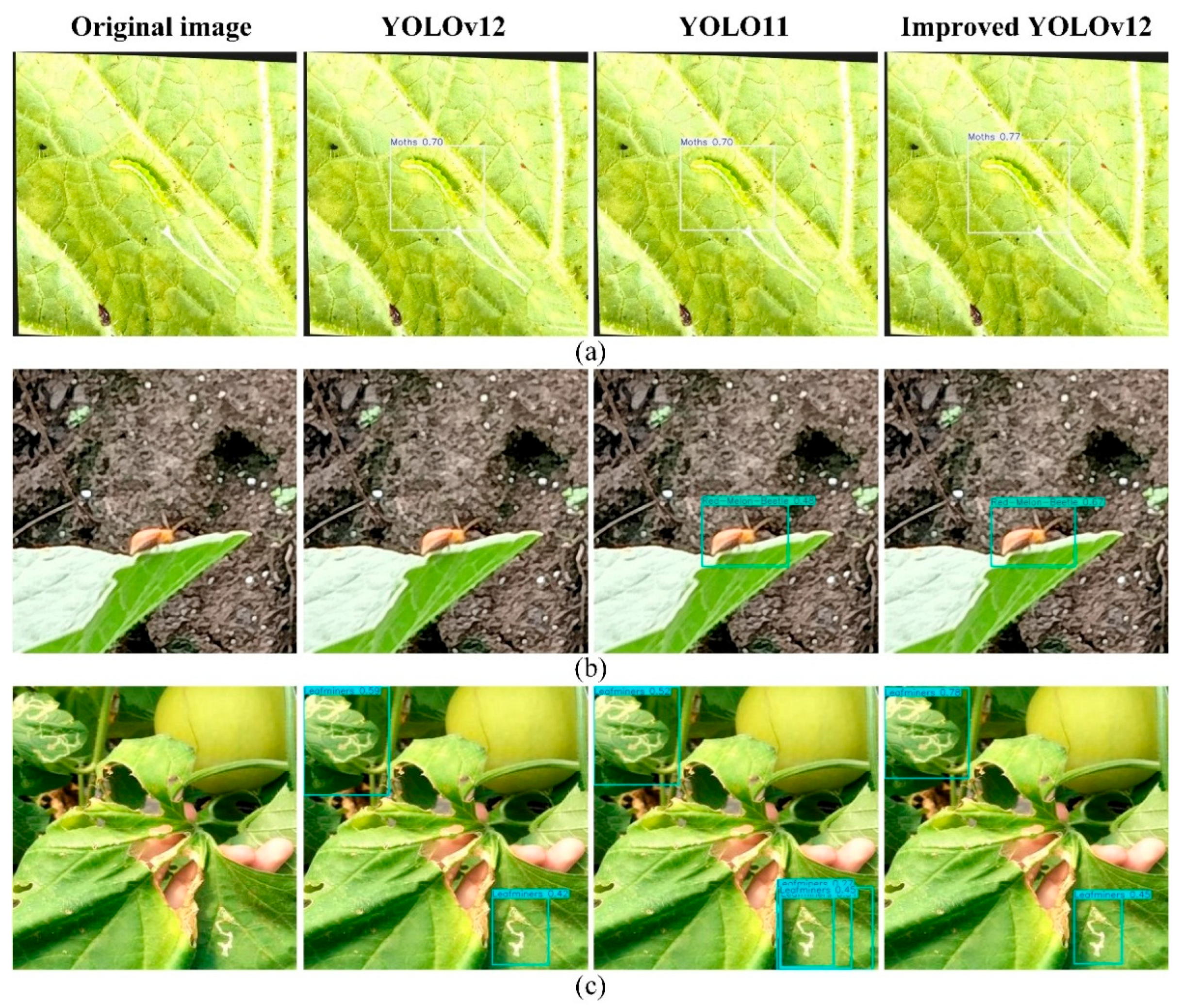 Figure 14. Comparison of detection results for different background pests using three models (YOLOv12, YOLO, and Improved YOLOv12). (a) the moth’s color blends with its background; (b) the image contains background information such as leaves and the ground; (c) The image contains complex backgrounds such as leaves, roots, stems, and fruits.