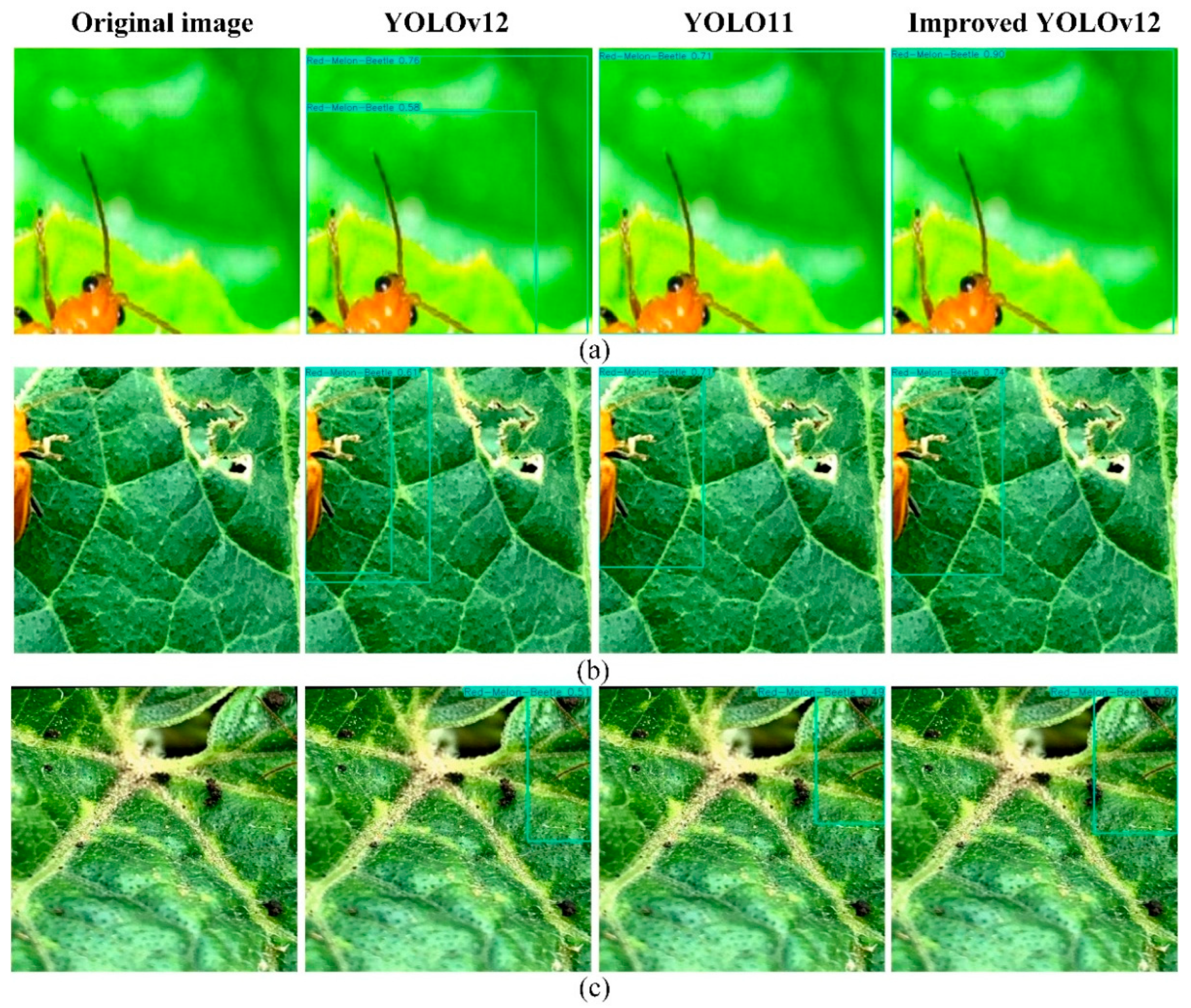 Figure 16. Comparison of detection results for pests with different levels of occlusion using three models (YOLOv12, YOLO, and Improved YOLOv12). (a) moderately obscured red-melon beetle; (b) Highly obscured red-melon beetle; (c) the nearly completely obscured red-melon beetle.