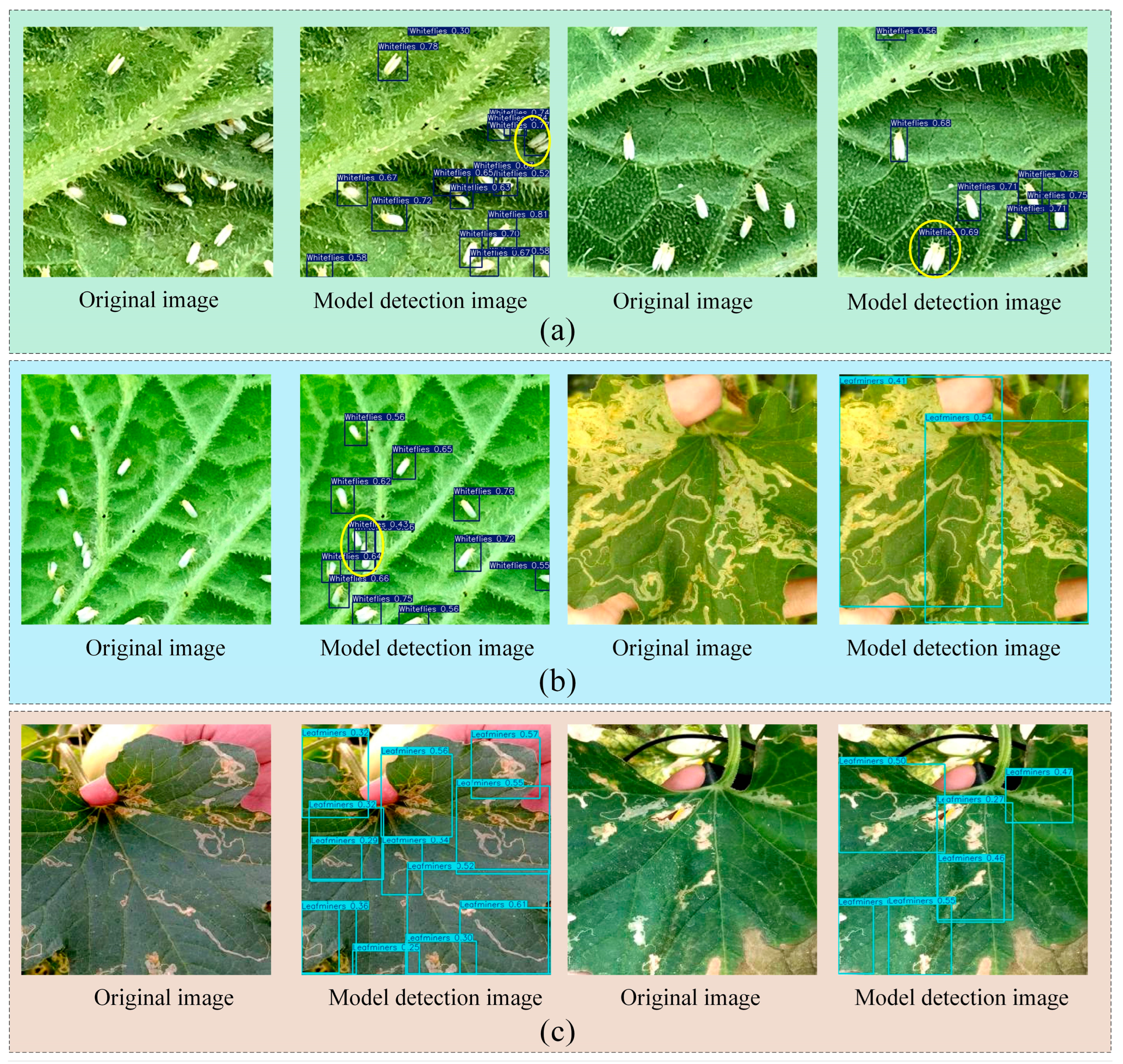 In cantaloupe leaves, pests of different sizes are often present, which makes accurate detection of the model difficult. Figure 13 shows the detection results for each model in this case. In the images of groups (a) and (b), aphids are densely distributed, vary in size, and are partially obscured. By refining the fusion strategy of the YOLOv12 model and introducing convolutions with different expansion rates in the C3k2 module, the model’s ability to capture features of pests of different sizes is enhanced. This improves the detection accuracy of pests under these conditions and mitigates the issue of duplicate detections present in the original model to a certain extent. In group (c), the whiteflies are tiny and make up much less than 5% of the entire picture. Compared to the original model and YOLOv11, the improved YOLOv12 model incorporates an EMA attention mechanism, enhancing its detection capability for small objects. Consequently, it achieves higher confidence scores, and the improved model does not exhibit the duplicate detection issues present in the original model.
