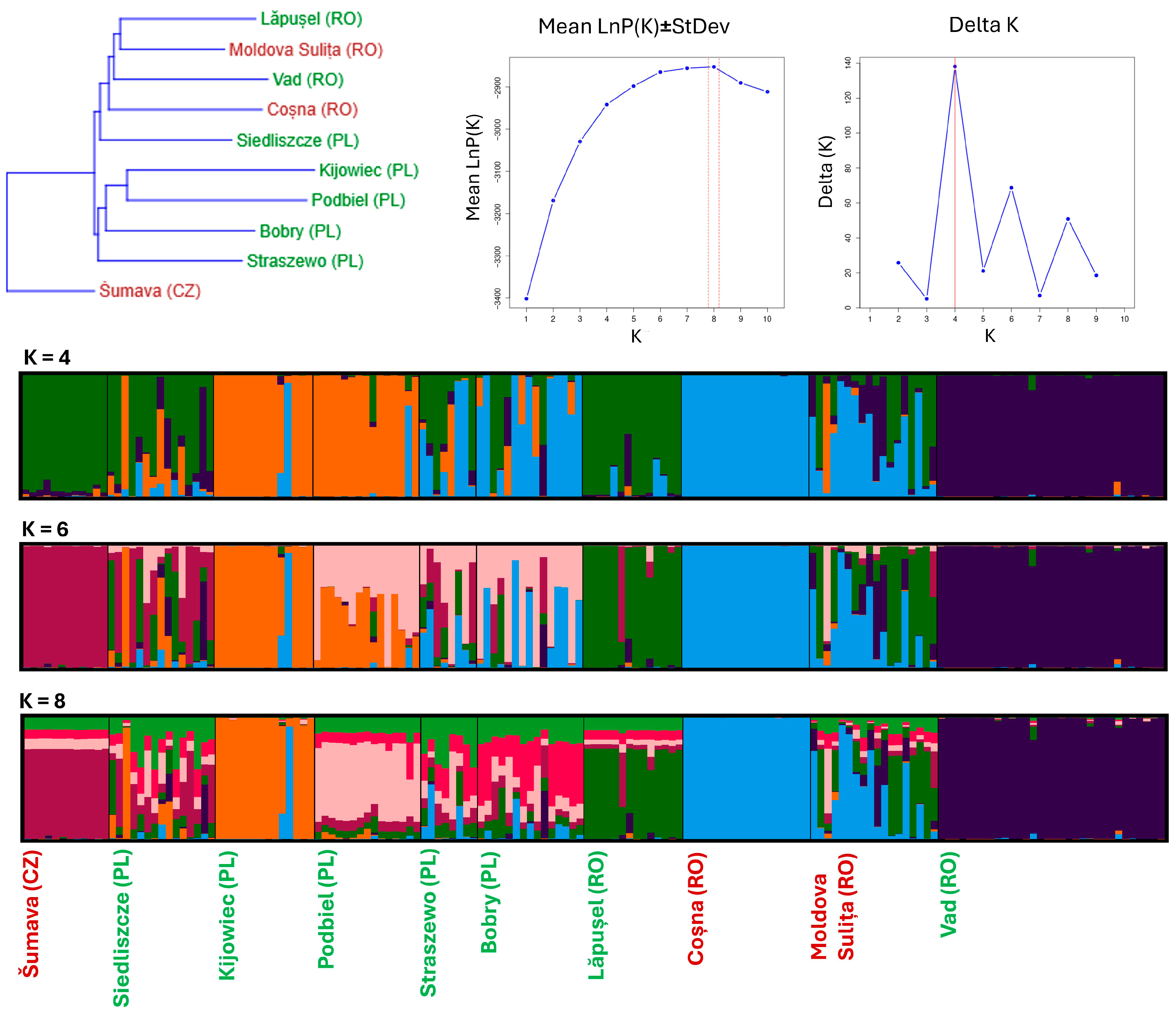 The structure analysis suggested division of the populations into four (Delta K method) or eight (likelihood of the K) clusters; six clusters were also permissible according to Delta K (Figure 2). According to all three approaches, the lowland RO population Vad and mountain RO population Coșna are genetically uniform and differentiated from all others. The lowland Lăpușel and mountain Moldova Sulita are genetically diverse, with the latter being more so, and Moldova Sulita contains alleles from both Coșna and Lăpușel. In PL, the southeastern Siedliszcze population is genetically diverse, Kijowiec and Podbiel are grouped together under K = 4, 6, and Straszewo is grouped with Bobry under all three Ks. The introduced CZ population differs from all others under K = 6, 8, whereas under K = 4, it is most related to the lowland RO population Lăpușel.