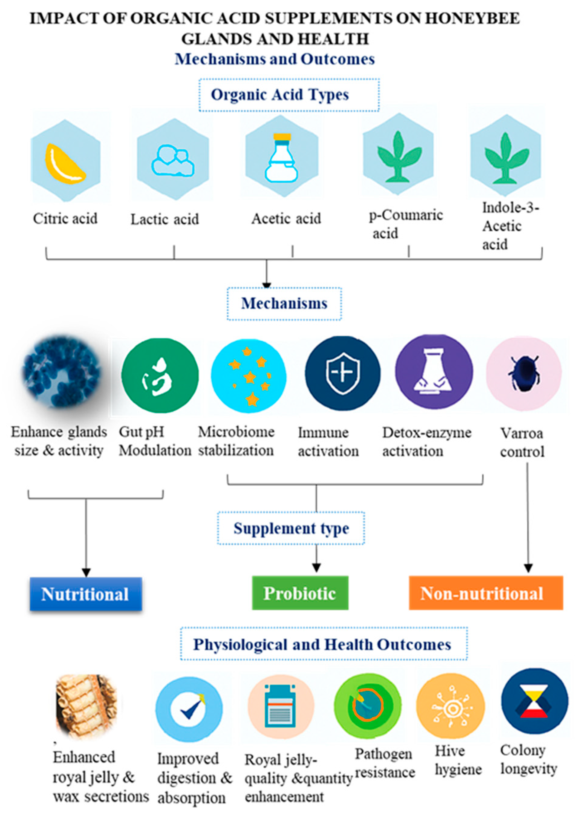 | Citric Acid | Direct acid (synthetic/natural) | MDG, HPG, Salivary glands | Enhances gland size, royal jelly quality, wax secretion, pollen consumption | [23,71,72,73] |