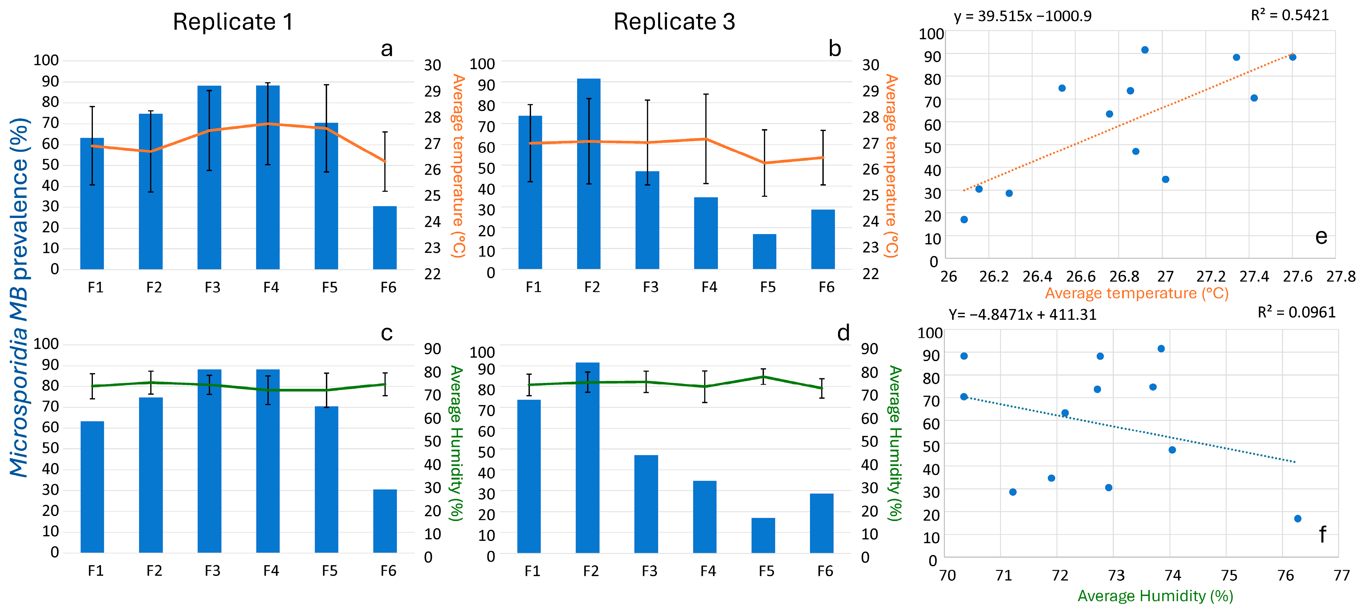 3.2. Microsporidia MB Prevalence Across Generations and Impact of Temperature and Humidity
