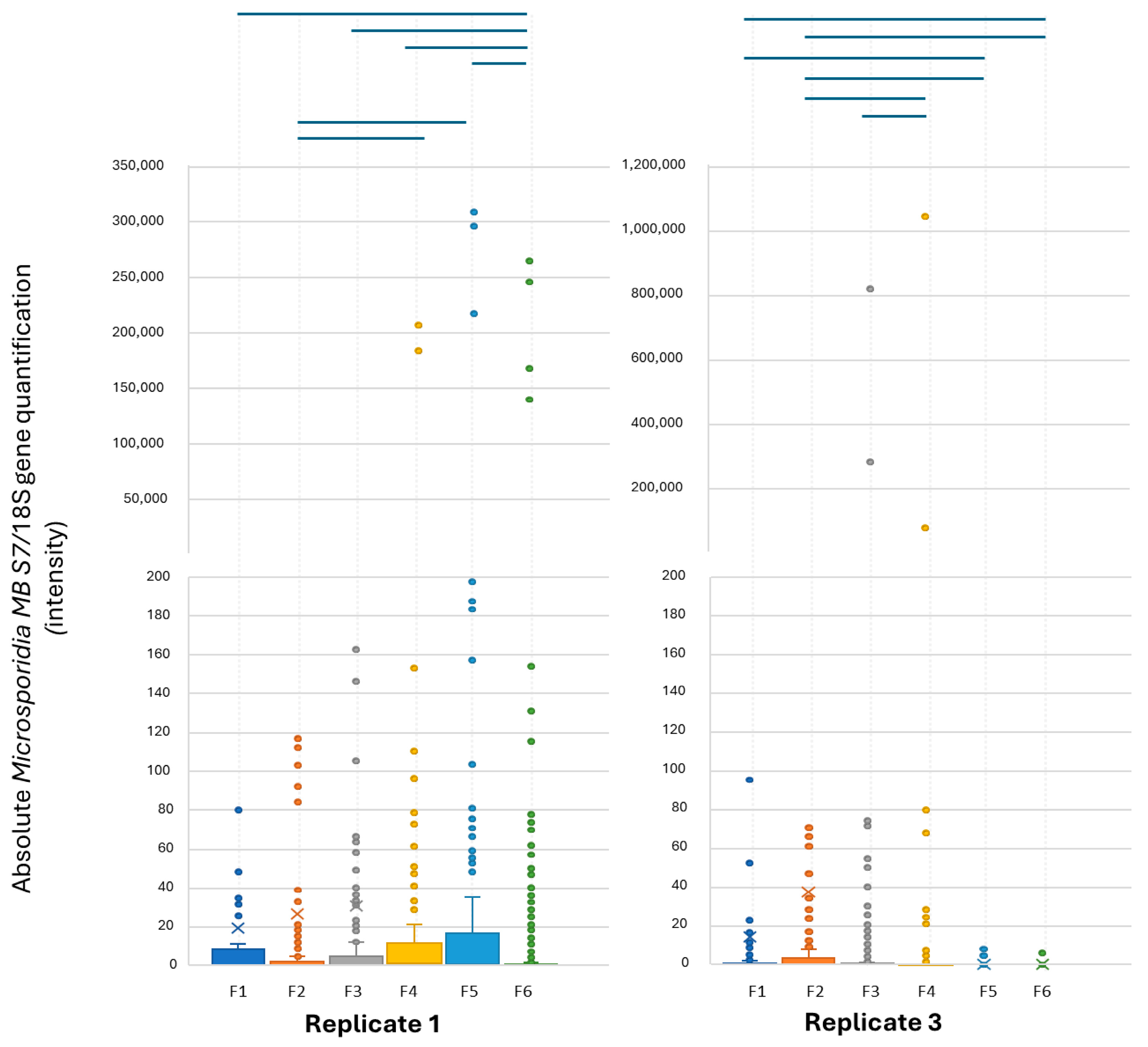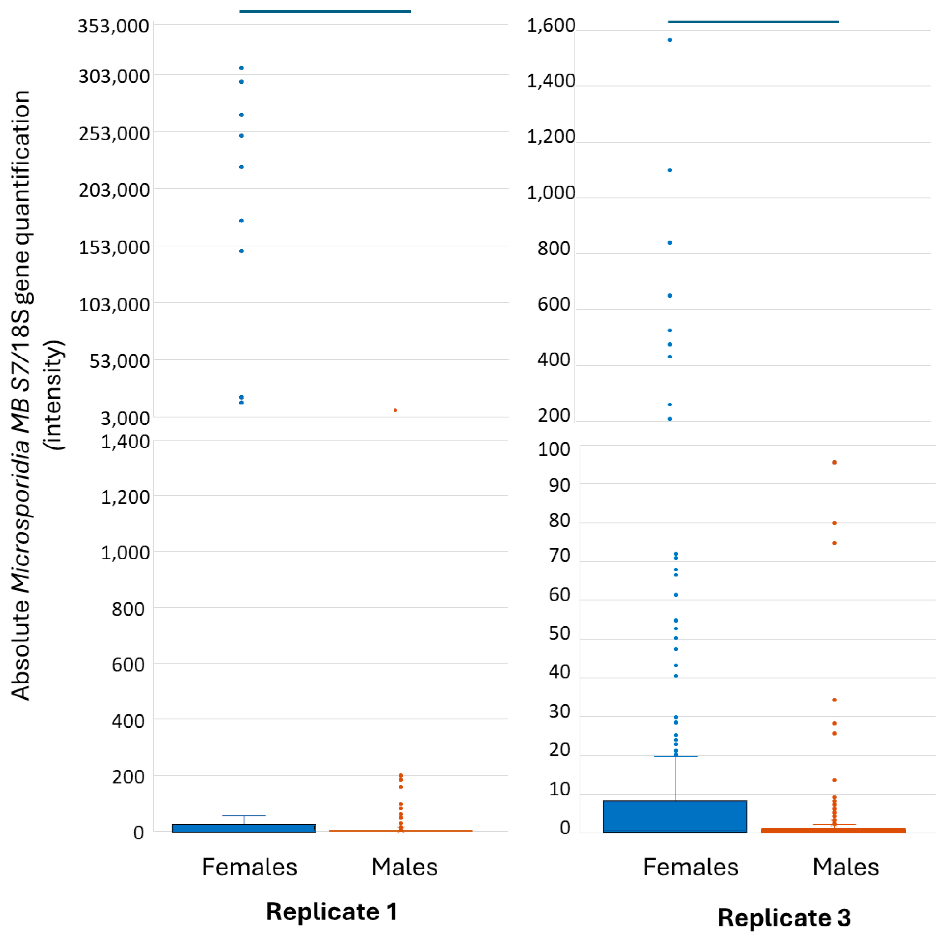 3.3. Microsporidia MB Intensity Across Generations and Sex