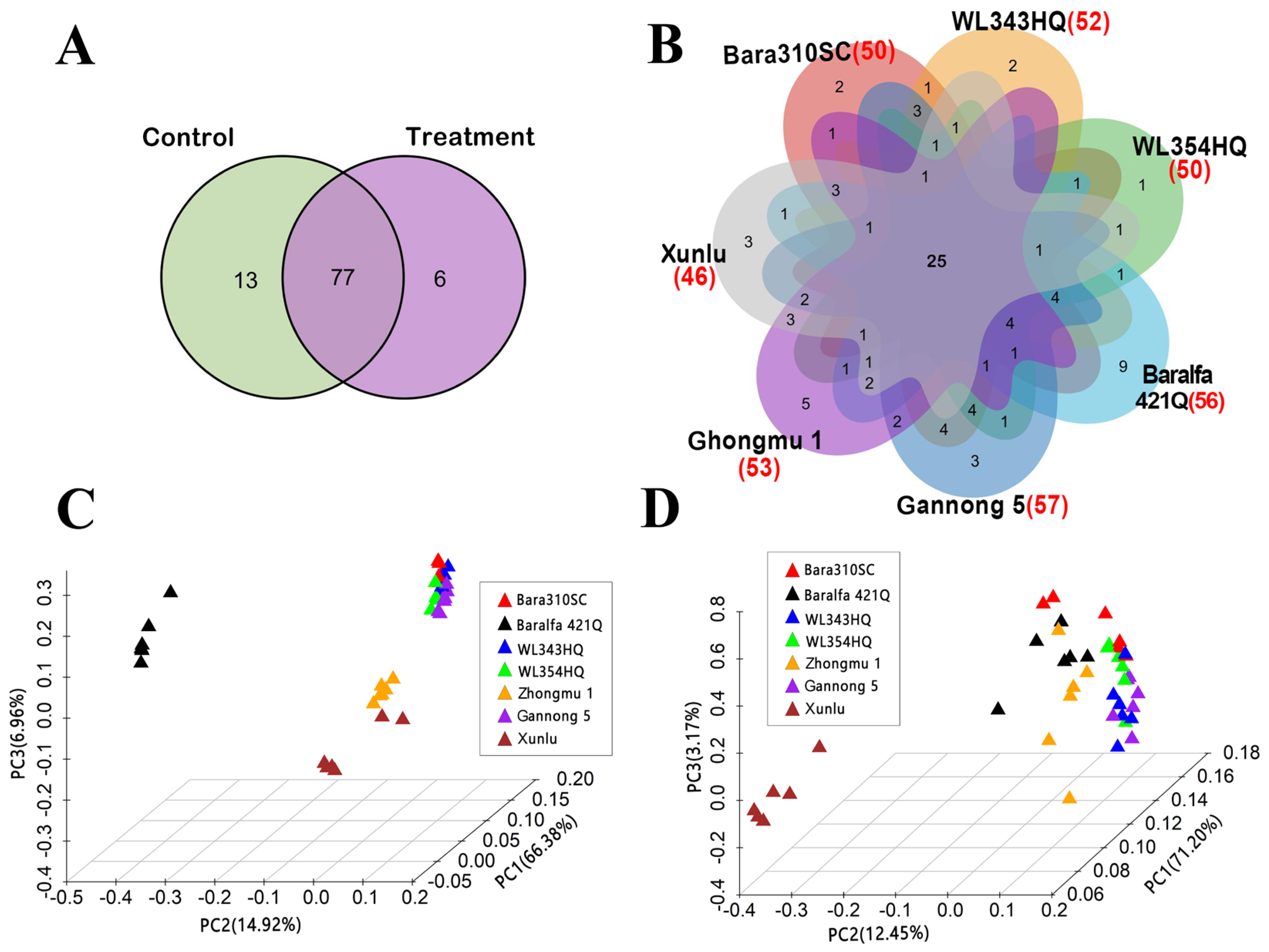 Figure 1. Composition of volatile compounds of control and Odontothrips loti-infested plants in all seven alfalfa cultivars (Bara310SC, WL343HQ, WL354HQ, Gannong No.5, Baralfa 421Q, Zhongmu No.1, and Xunlu). (A) Venn diagram of the diversity of compounds control (plants without infestation) and treatment (infested plants). (B) Venn diagram of the compound diversity for all seven alfalfa cultivars. Numbers in brackets refer to the number of compounds identified for each cultivar. (C) Principal component analysis (PCA) of volatiles in the control plants. (D) PCA of volatiles in O. loti-infested plants. Number of replicates for control and thrips-infested plants for each cultivar was six.
