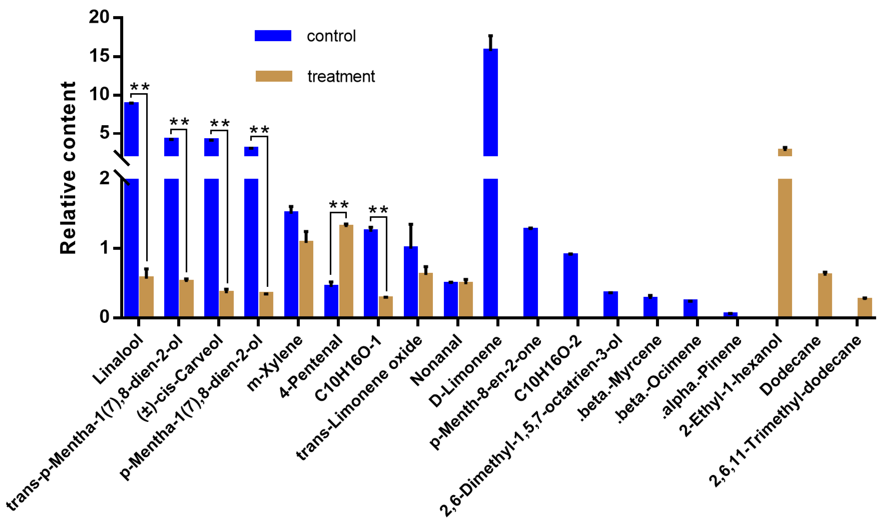 Figure 2. Mean (±SEM) changes in the relative content of identified volatile compounds without and with Odontothrips loti infestation in Baralfa 421Q. Multiple unpaired t-test was used to analyze the difference of relative content of each volatile between control and treatment; the significances of the changes are ** p < 0.01. Unknown compounds are represented by molecular formulae. Number of replicates was six.