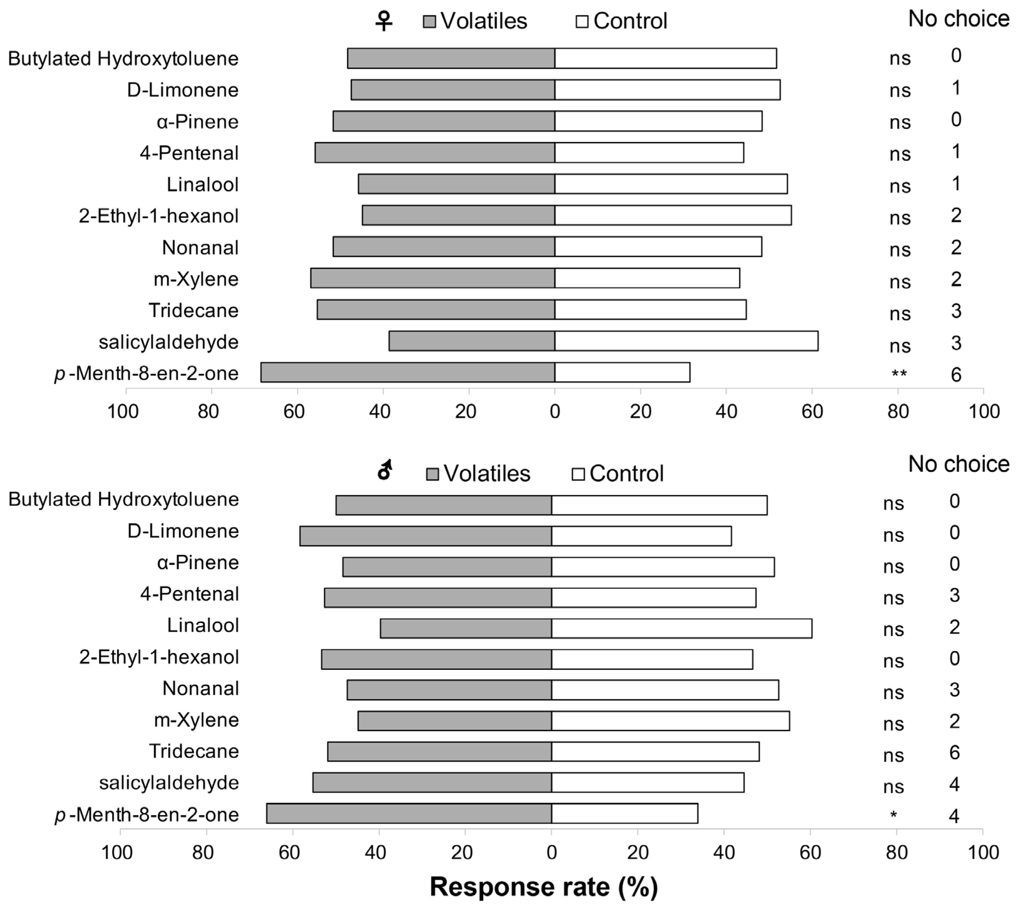 Figure 3. Responses of adult female (♀) and male (♂) Odontothrips loti to 11 volatiles in a Y-tube olfactometer. Chi-squared test, df = 1, the significances in response indicated as follows: ns—no significant difference, * p < 0.05, and ** p < 0.01. Total number of replicates for male and female for each compound was sixty. The number of thrips not responding was between 0 to 10%.