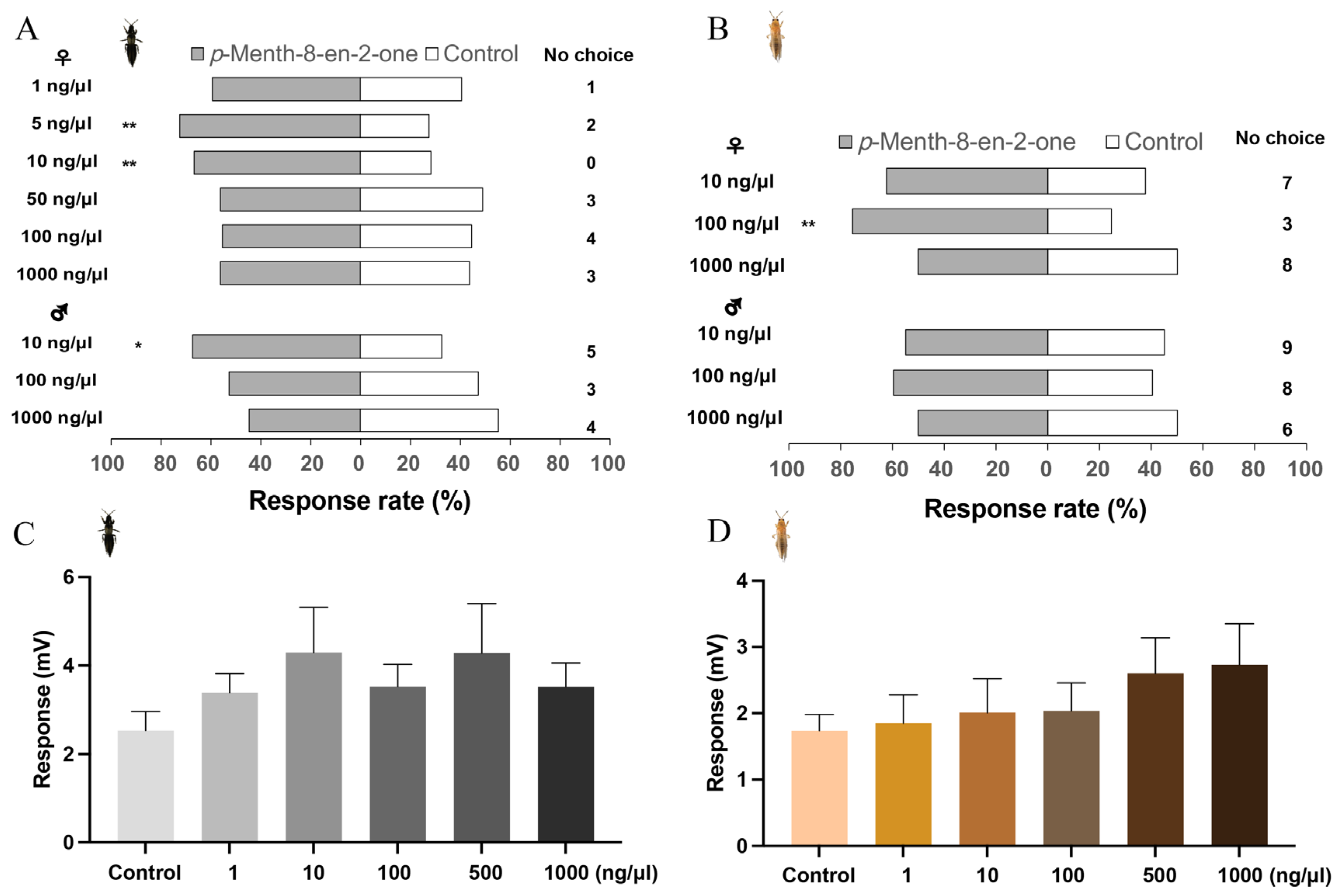 Figure 4. Effect of different concentrations of p-Menth-8-en-2-one on the behavioral (%) and EAG (millivolt, mV) responses by adult female Odontothrips loti and Frankliniella. occidentalis, respectively. Odontothrips loti behavioral (A) and EAG (C) responses to p-Menth-8-en-2-one in relation to the control compound (paraffin oil); number of replicates for each concentrate was eight. Frankliniella occidentalis behavioral (B) and EAG (D) responses to p-Menth-8-en-2-one in relation to the control; number of replicates for each concentrate was ten. Chi-squared test was used for behavioral data, df = 1, the significances in response to indicated as * p < 0.05 and ** p < 0.01, total number of replicates for male and female for each concentrate was sixty, the number of O. loti and F. occidentalis not responding was between 0 to 8% and 5–15%, respectively. One-way ANOVA was performed for EAG data, no significances detected.