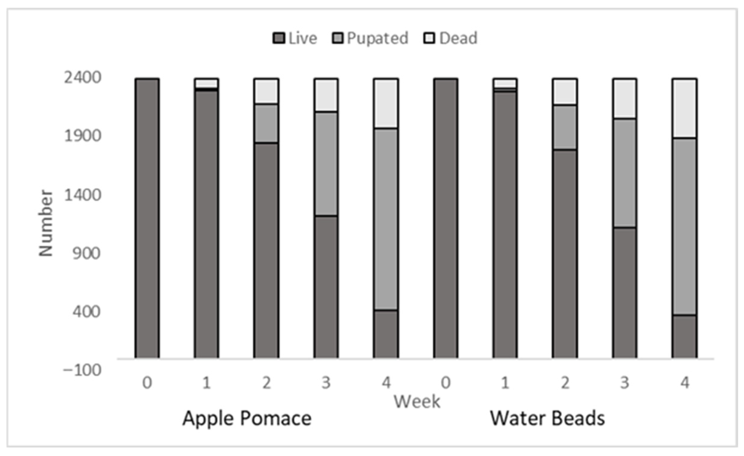 The Life Table analysis showed survival rates of 66.71% for larvae provided with water beads and 73.28% for those fed apple pomace over the four-week treatment period (Table 2). There was a significant difference between cohorts (χ2 = 12.7954, DF = 1, p < 0.001), according to the Log-Rank Test for Equality of Survival Functions, indicating that the larvae in the apple pomace cohort had better survival than those in the water bead cohort.