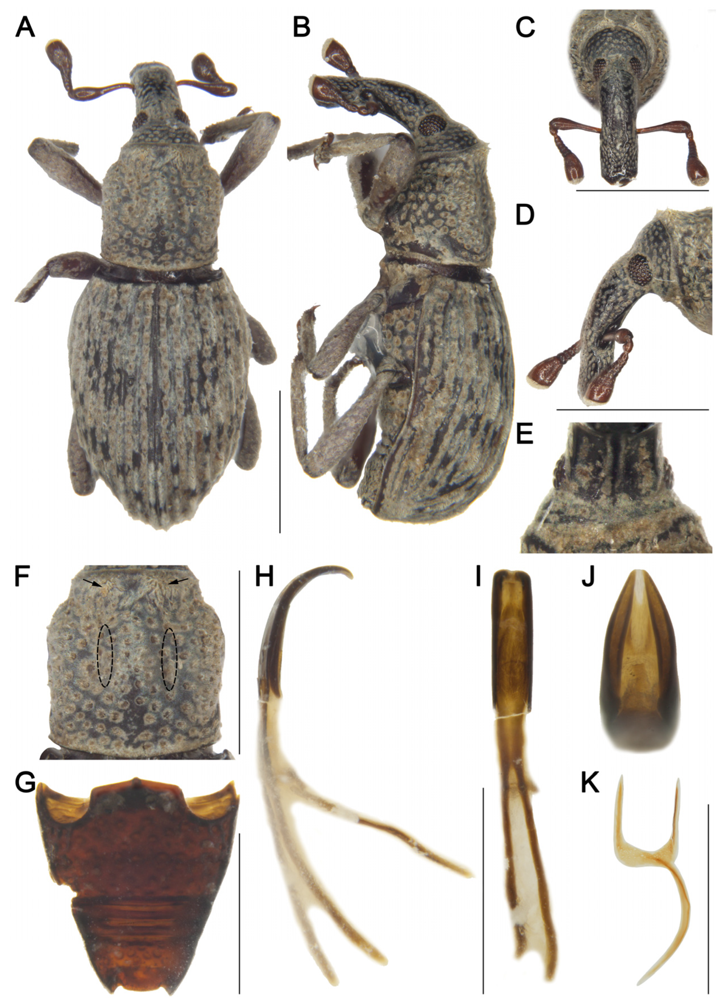 - Head (Figure 4C–E). Forehead flat, slightly narrower than rostrum base width; eyes oval, length exceeding longest side of antennal club, barely visible ventrally; rostrum elongate (Rl/Rw 3.52), longer than pronotum (Rl/Pl 1.43), evenly curved in lateral view, from base to apical 1/6 with short pubescence, apex with dense punctures; antennae inserted slightly anterior to middle of rostrum; scape long (l/w 4.70), not reaching eyes, gradually broadening from base to apex, apical 1/3 markedly widened; funicular segments 1 and 2 elongate, segment 2 funnel-shaped, longer than segments 3+4 combined; segments 3–6 transverse; club subconical (l/w 1.86).