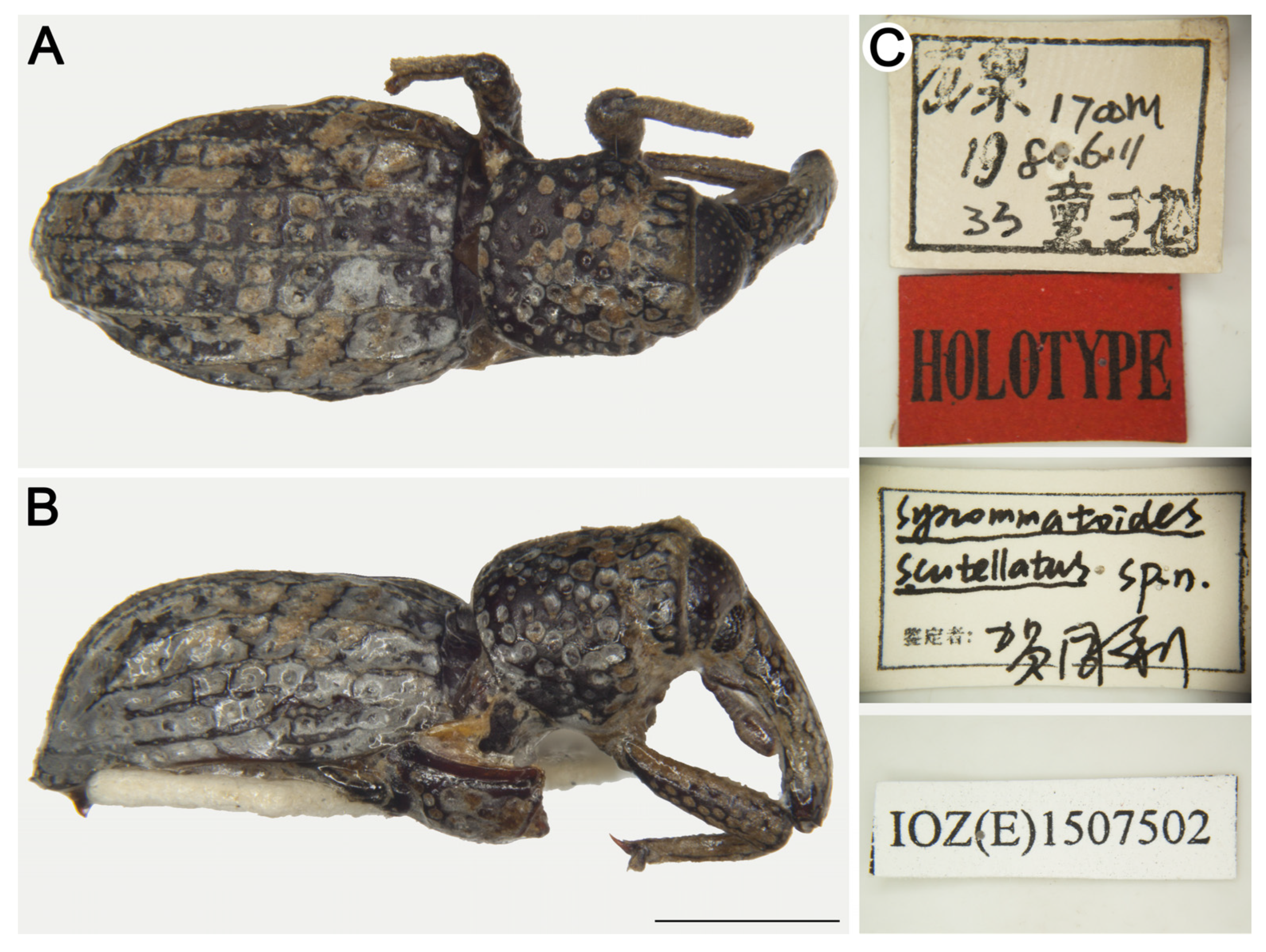 - Remarks. He et al. [26] distinguished this species from S. shirozui by the following characters: scutellum present and tiny; apical margin of pronotum punctate with two pilose pustules; antennae stout and more compact. These characters are not diagnostic, as the apical margin of the pronotum in S. shirozui also bears two pilose pustules. Based on the present study of the type specimen of S. scutellatus and the holotype images of S. shirozui from Grebennikov [7], we identify the following reliable characters to distinguish the two species: (I) pronotum not rugose-punctate (vs. rugose-punctate in S. shirozui); (II) odd elytral interstriae with interrupted pilose pustules, strial punctures very large, distance between punctures about 0.3 times a puncture diameter (vs. continuous pilose pustules, strial punctures large, distance between punctures subequal to puncture diameter in S. shirozui).