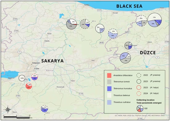 To determine the species composition and relative abundance of egg parasitoids associated with GSB and BMSB, the naturally laid eggs collected from hazelnut orchards were examined for parasitism. As a result of this examination, the eggs of GSB and BMSB were found to be parasitized by T. belenus, T. cultratus, T. turesis, T. truncatus, and A. bifasciatus. In GSB, the most dominant species across 2022 and 2023 was T. belenus (42.51%), followed by T. turesis (26.47%), T. cultratus (23.95%), T. truncatus (6.80%), and A. bifasciatus (0.27%). In 2022, the parasitism rates of GSB eggs were recorded as T. belenus (41.81%), T. cultratus (24.36%), T. turesis (26.60%), and T. truncatus (7.23%). In 2023, the corresponding rates were T. belenus (42.91%), T. turesis (26.40%), T. cultratus (23.72%), T. truncatus (6.56%), and A. bifasciatus (0.42%). As mentioned earlier, only a low parasitism rate (1.98%) was detected in BMSB eggs. Among the responsible species, T. belenus constituted the highest proportion (26.19%), followed by T. truncatus (16.67%) and A. bifasciatus (15.48%). In 2023, parasitism in BMSB eggs reached 38.10% by T. belenus and 61.90% by A. bifasciatus. In the following year, equal parasitism rates (22.22%) were observed for both T. belenus and T. truncatus (Table 2). The composition of egg parasitoids of GSB and BMSB, together with their spatial distribution across Sakarya and Düzce provinces and their temporal variations, is presented in Figure 2.