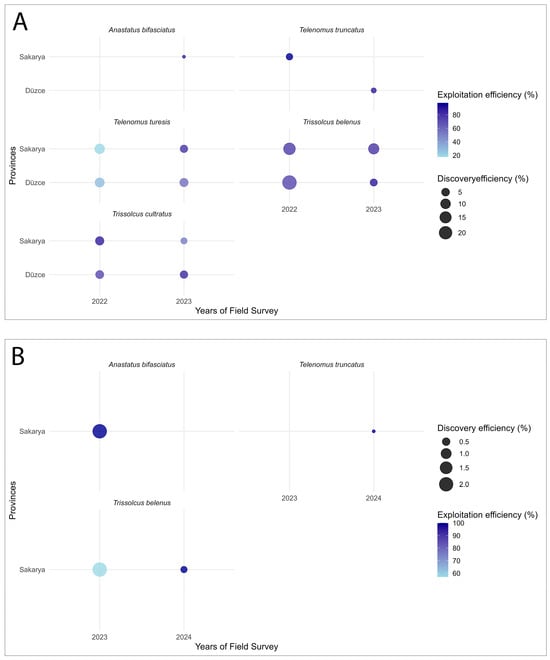 To evaluate the host use performance of egg parasitoids, discovery and exploitation efficiencies were calculated for each species on GSB and BMSB eggs. In GSB eggs, T. belenus showed the highest exploitation (ratio of parasitized eggs to the total number of eggs in only those egg masses that were found to be parasitized; 89.83%) and discovery (ratio of the number of egg masses discovered by the parasitoid (i.e., those containing at least one parasitized egg) to the total number of collected egg masses; 24.88%) efficiencies, with significant differences in exploitation efficiency across years and Year × Province combinations (p < 0.05). However, the discovery efficiency of T. belenus did not vary significantly within the species across years and provinces (p > 0.05). It was followed by T. cultratus (88.10%; 6.35%) and T. turesis (79.97%; 9.62%), for which significant differences in exploitation efficiency were also detected across years, provinces, and Year × Province combinations (p < 0.05). Additionally, a significant difference in the discovery efficiency of T. turesis was also detected across years (p < 0.05). Telenomus truncatus (97.56%; 2.78%) and A. bifasciatus (87.50%; 0.08%) also displayed high exploitation efficiencies, although their discovery abilities were notably low and based on limited sample sizes (Figure 4A).