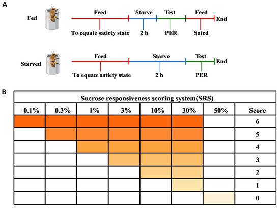 The sucrose responsiveness assay was performed according to the method of Huang et al. [5]. Honeybees were divided into two groups: fed honeybees (FB; honeybees starved for 2 h and then fed, serving as the control) and starved honeybees (SB; honeybees starved for 2 h) (Figure 1A). Honeybees were first anesthetized on ice for 1–2 min and then immediately transferred to copper restraining tubes for the proboscis extension response (PER) assay [30,32,33]. Food wanting was quantified using PER, a reflexive response triggered by antennal stimulation with sucrose solution. The restrained honeybees were standardized by cyclically feeding each honeybee 5 μL of ultrapure water and 50% (w/w) sucrose solution within 10 min to ensure uniform hunger and thirst levels. Before the test, honeybees were maintained in an incubator for a 2 h starvation period. Individual responsiveness was measured by presenting a series of sucrose solution concentrations (0.1, 0.3, 1, 3, 10, 30, and 50%; w/w) [34,35,36,37]. Before each sucrose solution presentation, all honeybees were tested for their response to pure water to control for the potential effects of repeated sucrose stimulations, which could have led to either sensitization or habituation. Honeybees were mounted using wooden toothpicks dipped in sugar water or ultrapure water in the following order: 0.1%, ultrapure water; 0.3%, ultrapure water; 1%, ultrapure water; 3%, ultrapure water; 10%, ultrapure water; 30%, ultrapure water; and 50%, to carry out the sucrose responsiveness assay (Figure 1B). At the end of the experiment, a sucrose responsiveness score (SRS) was obtained for each honeybee based on the sucrose concentrations to which the honeybees responded. The response was arbitrarily quantified with scores of 0 to 6, where 0 represented a honeybee that only responded to the highest sucrose concentration and 6 represented an individual that responded to all concentrations tested. Honeybees that failed to respond to any sucrose concentration were excluded from further analysis, as were honeybees that responded to all sucrose concentrations and water, since they could not discriminate between the two. Finally, qualified honeybees were rapidly frozen in liquid nitrogen and stored at −80 °C.