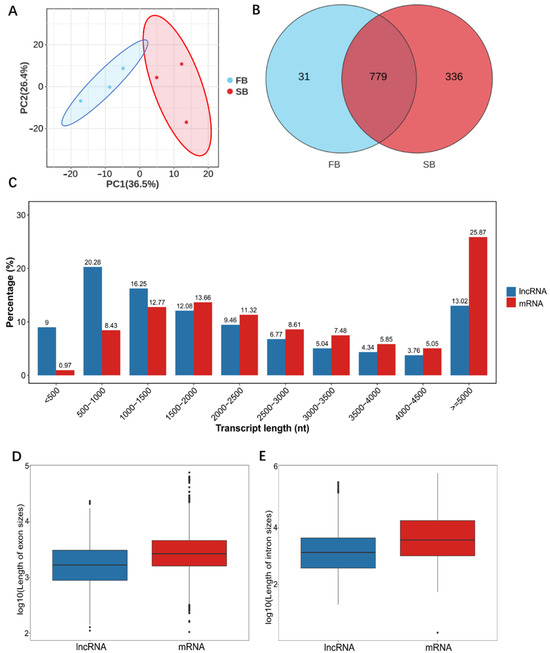 Structural features of lncRNAs and mRNAs in the FB and SB groups. (A) Principal component analysis (PCA) of lncRNA expression profiles in FB and SB groups. (B) Venn diagram of lncRNAs in the two groups. (C) Total intron length of lncRNAs and mRNAs. (D) Total exon length of lncRNAs and mRNAs. (E) Length distribution of lncRNAs and mRNAs.