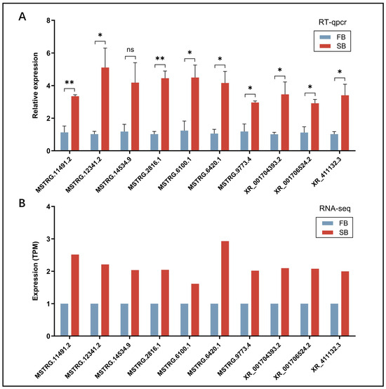(A) RT-qPCR validation of the expression levels of ten randomly selected DElncRNAs. (B) RNA-seq expression profiles of the same ten DElncRNAs. ns, not significant; * p < 0.05, ** p < 0.01.