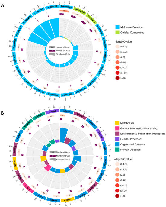 Based on the method of Feng et al. [25], genes located within 10 kb upstream or downstream of each DElncRNA were identified as potential cis-acting targets. This 10 kb window was selected based on the average gene density and intergenic distances in the honeybee genome (Apis mellifera, Amel_HAv3.1), which is consistent with previous studies in insects [25,28,40]. Candidate genes were aligned using the NCBI BLAST (version 2.17.0) tool and subsequently annotated for Gene Ontology (GO) functions and Kyoto Encyclopedia of Genes and Genomes (KEGG) pathways.