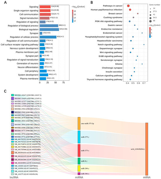 Multiple RNA species, including lncRNAs, can modulate downstream gene expression by competitively binding miRNAs, thereby influencing biological processes such as host behavior, which is a mechanism known as competing endogenous RNA (ceRNA) regulation [19]. GO enrichment analysis revealed that the target genes involved in this network are mainly associated with synapse, plasma membrane, and cell periphery in the cellular component category, and are significantly enriched in biological processes such as signal transduction, regulation of biological processes, and nervous system development (Figure 7A). KEGG pathway analysis revealed that the top 20 enriched pathways were mainly associated with neural and hormonal signaling, including dopaminergic, cholinergic, and calcium signaling pathway, as well as PI3K-Akt, Notch, and Wnt pathways (Figure 7B). Integrating RNA-seq data with RT-qPCR validation, we identified ncbi_410638 (Ddc), a key gene involved in dopamine synthesis, as a potential regulator of food wanting. Based on this finding, a ceRNA regulatory network centered on Ddc was constructed (Figure 7C). The analysis showed that 28 lncRNAs, including MSTRG.10347.2, may simultaneously target six miRNAs such as ame-miR-375-3p, which in turn co-regulate the expression of Ddc. The detailed targeting relationships among DElncRNAs, DEmiRNAs, and DEmRNAs in FB and SB groups are provided in Table S5.