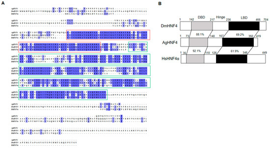 Sequence alignment and domain structure of AgHNF4. (A) Multiple sequence alignment of HNF4 proteins from DmHNF4, AgHNF4, and HsHNF4α. Conserved regions are shaded in blue, with DBD (red box) and LBD (green boxes) highlighted, showing high sequence conservation across species. (B) Schematic representation of HNF4 amino acid domain structures. The DBD, hinge region, and LBD are indicated. Percentages indicate the amino acid identity between AgHNF4 and its orthologs DmHNF4 and HsHNF4α, demonstrating strong conservation in the DBD and moderate conservation in the LBD.