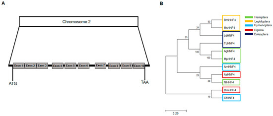 AgHNF4 identification and phylogenetic tree analysis. (A) Genomic organization of the gene located on chromosome 2, consisting of 10 exons spanning from the ATG start codon to the TAA stop codon. (B) Phylogenetic tree analysis of HNF4 proteins from different insect orders (Hemiptera, Lepidoptera, Hymenoptera, Diptera, Coleoptera). AgHNF4 clusters with other hemipteran HNF4 proteins, indicating evolutionary conservation. The accession numbers and abbreviations for HNF4 for different species are provided in the Section 2.