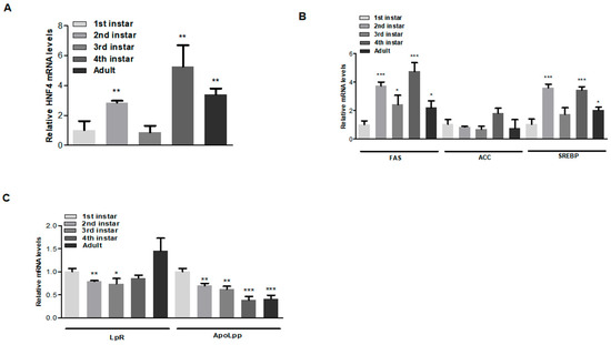 To examine HNF4 expression levels in A. gossypii during various developmental stages, mRNA expression was analyzed across stages from the 1st instar to adult. Expression levels were significantly higher in the 2nd instar, 4th instar, and adult stages (Figure 4A). Similarly, genes involved in lipid metabolism and lipid transport were analyzed to assess their effects during aphid development. Notably, FAS and SREBP showed a similar expression pattern to HNF4, whereas ACC was not significantly affected (Figure 4B). For LpR and ApoLpp, LpR mRNA levels were consistent and significantly higher during the 2nd and 3rd instar stages, peaking at the adult stage. ApoLpp levels gradually decreased but remained significant across developmental stages (Figure 4C). We speculate that ApoLpp, being a lipid transport protein, circulates throughout development and declines during the adult stage. These findings suggest that HNF4 expressions are developmentally regulated and play a predominant role in specific stages of aphid development.