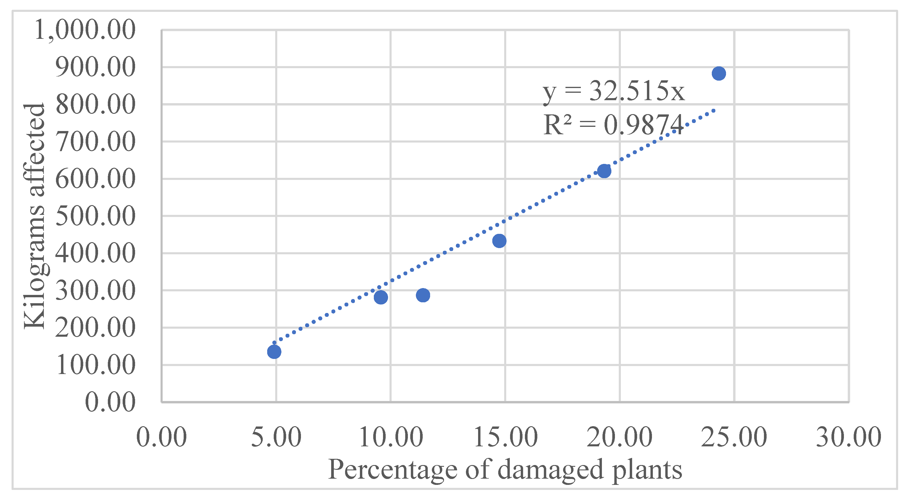 | Treatment | Percentage of Damaged Plants | Average Yield/ha | Reduction in Yield (kg) |