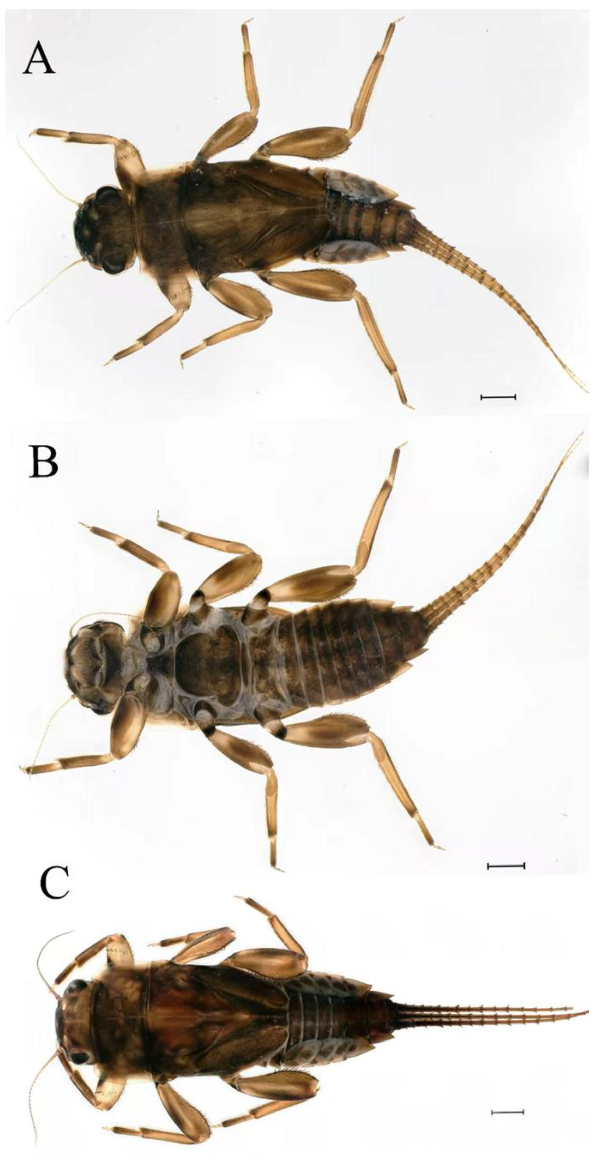 - Uéno, M. Some Japanese mayfly nymphs. Mem. Coll. Sci. Kyoto Imp. Univ. Ser. B 1928, 4, 19–63. [Google Scholar]