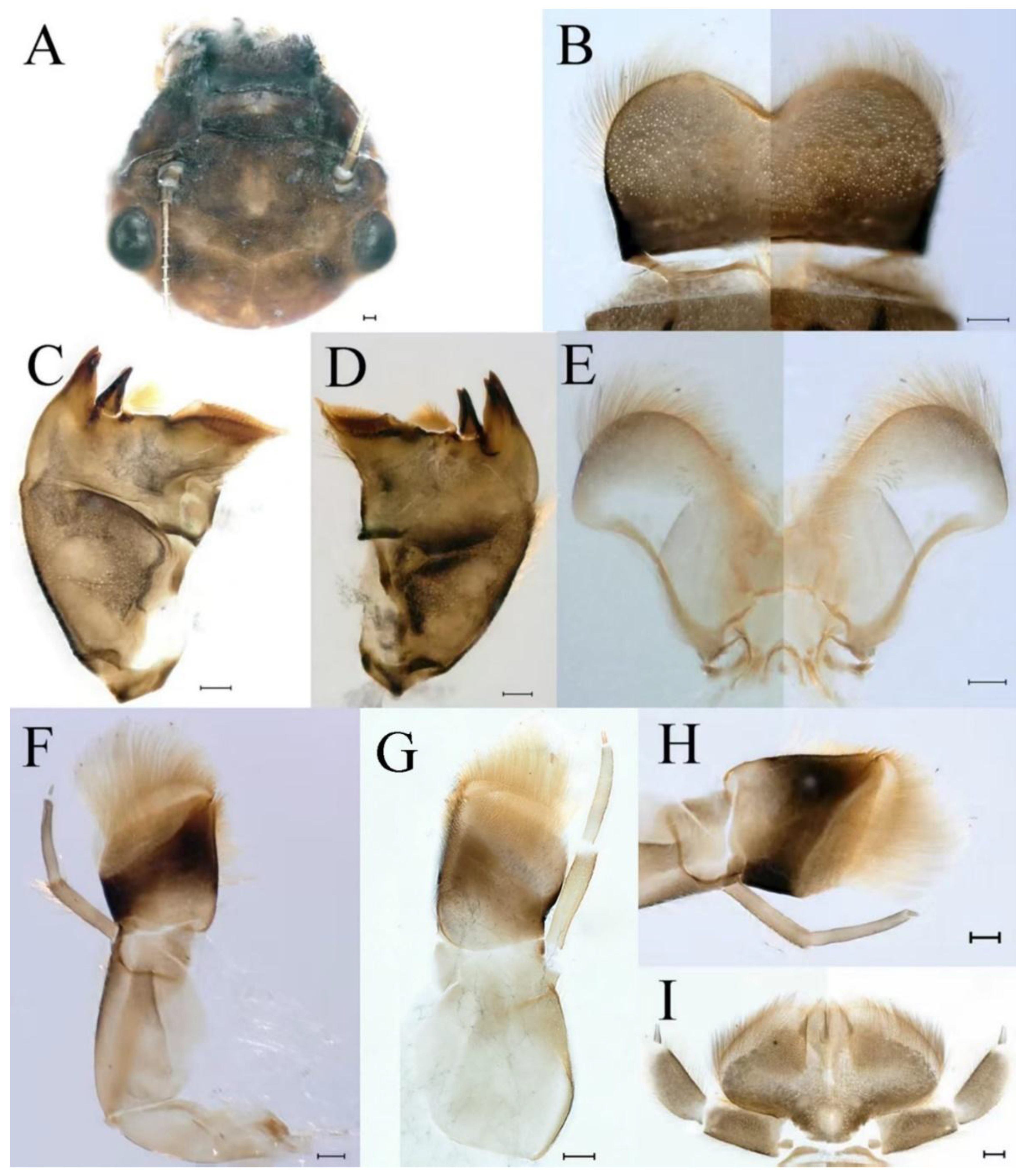 - Li, B.; Shi, W.; Li, X.; Tong, X. Two new species of the genus Nigrobaetis Kazlauskas (in Novikova & Kluge), 1987 (Ephemeroptera: Baetidae) from Southwest China. Zootaxa 2023, 5315, 131–149. [Google Scholar] [CrossRef] [PubMed]