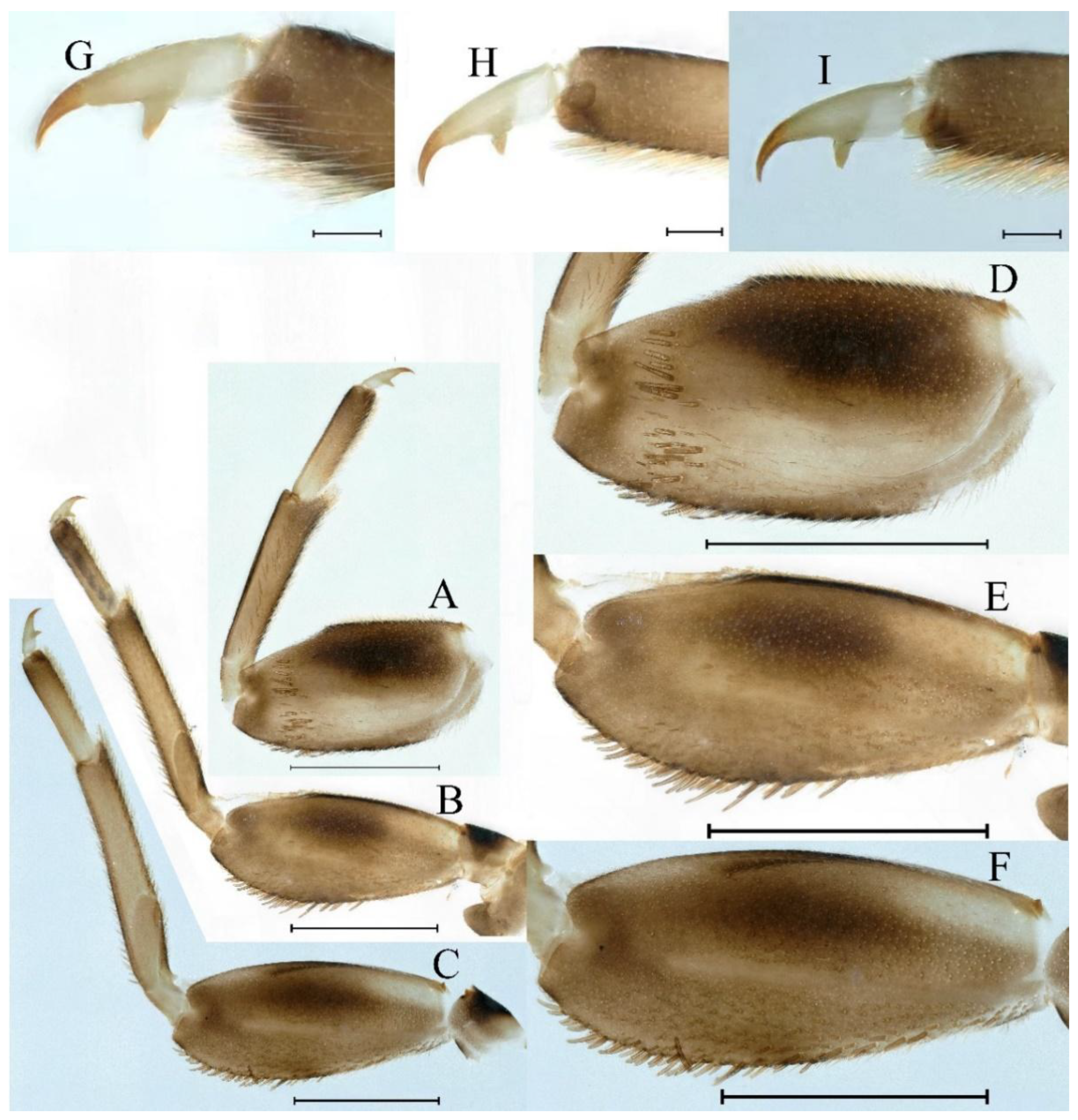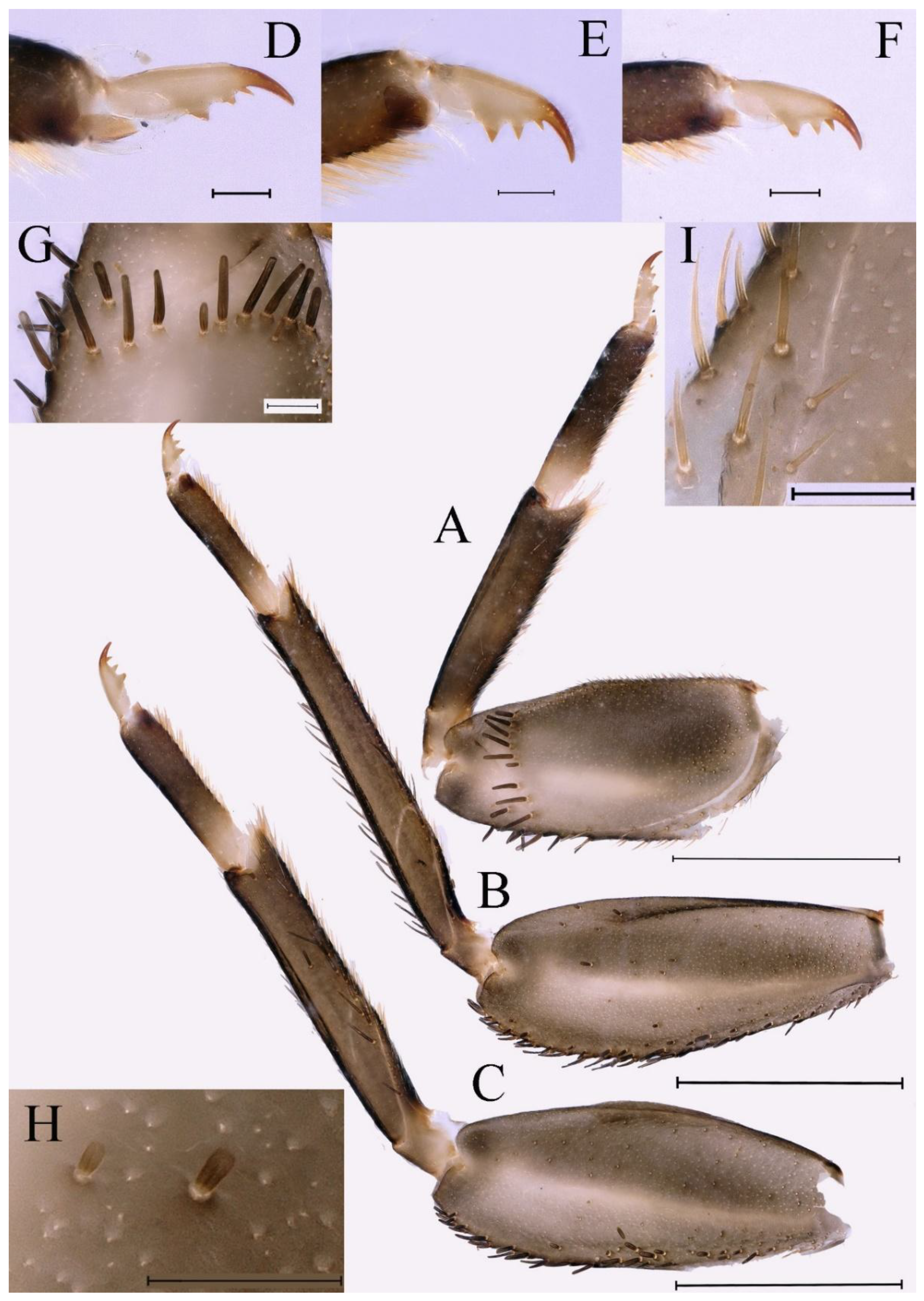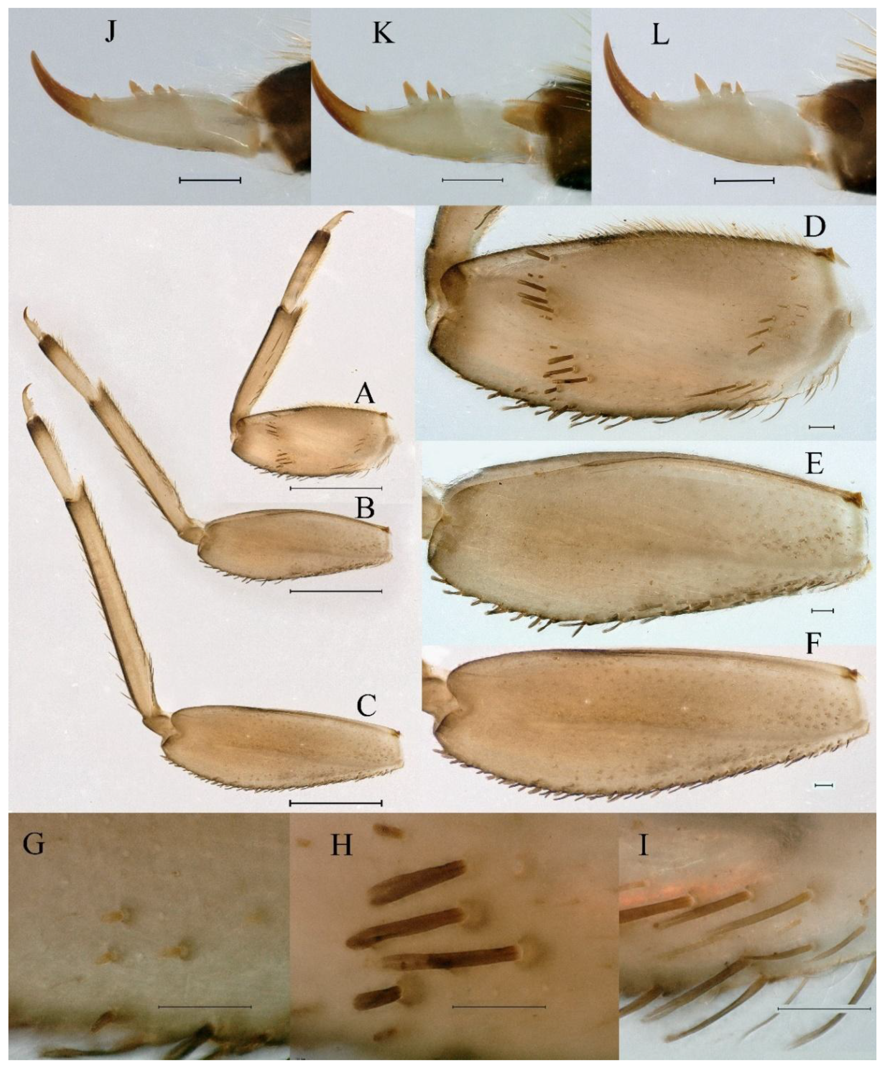 - 9′. Tarsal claw with more than one denticle, labrumanteromedian emargination shallow and narrow (e.g., Figure 55C); eastern Palearctic and Indomalayan.….....…..............…....10