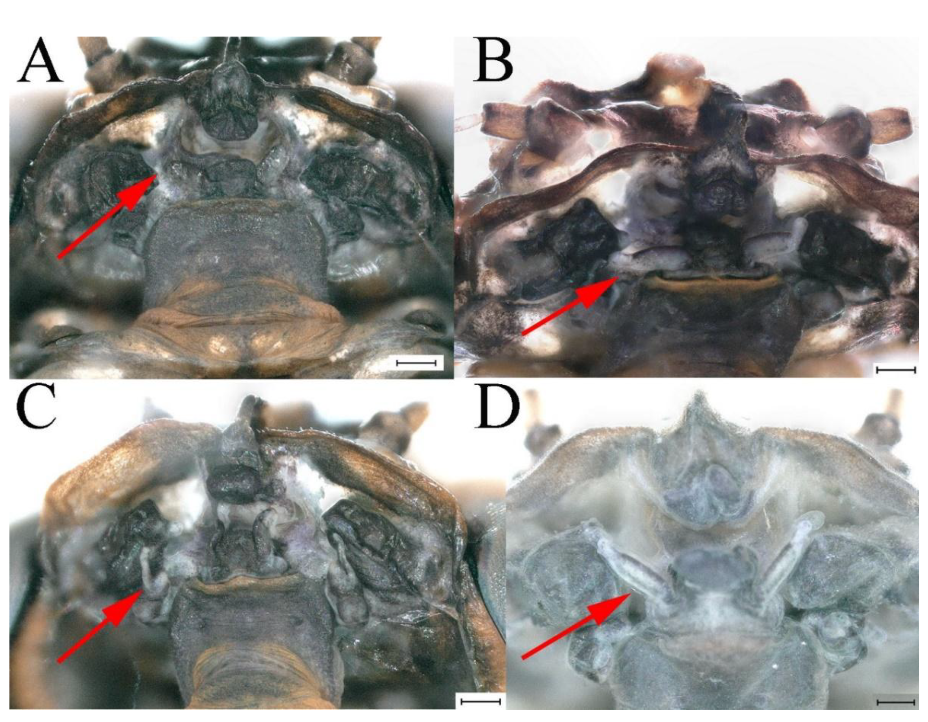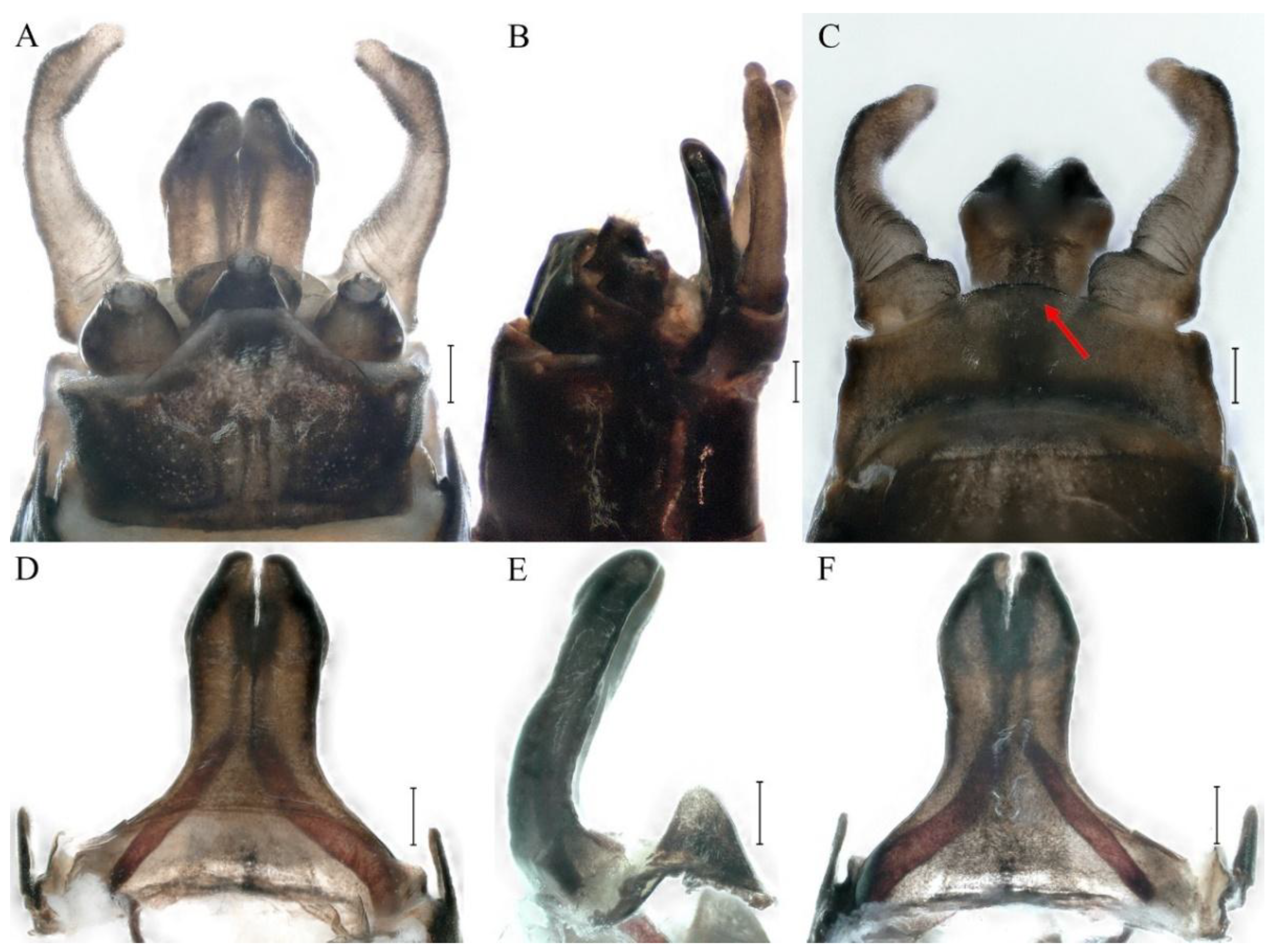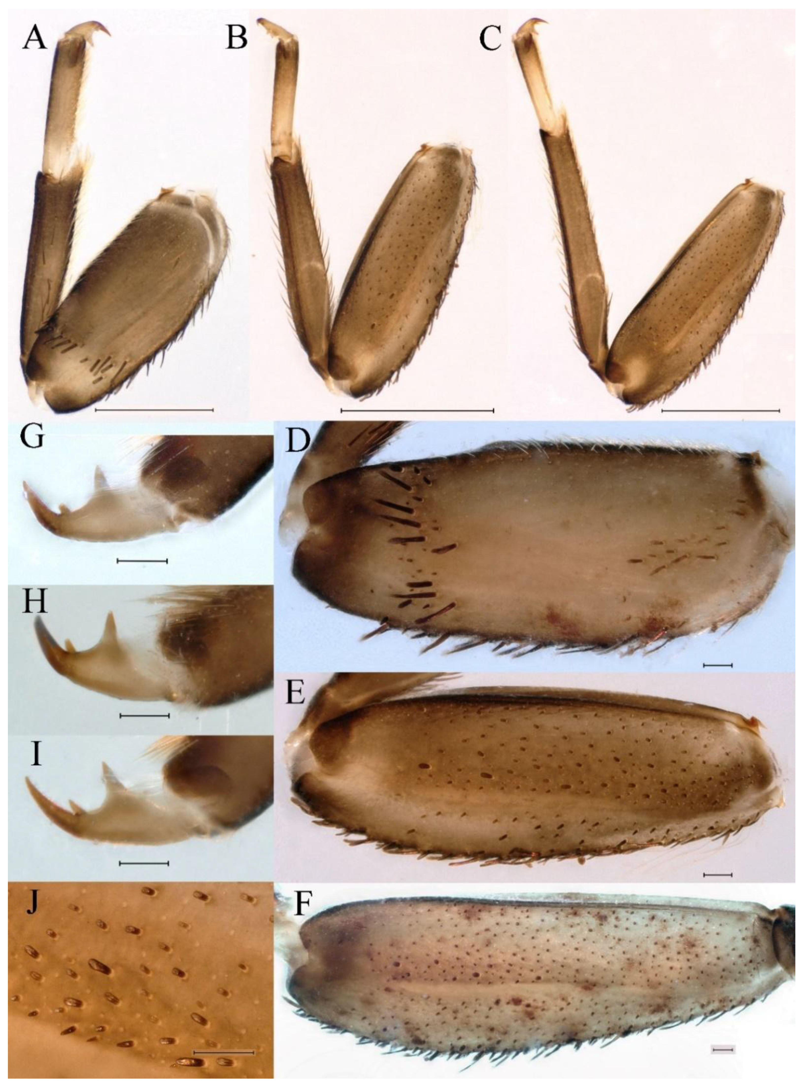 - 9′. Tarsal claw with more than one denticle, labrumanteromedian emargination shallow and narrow (e.g., Figure 55C); eastern Palearctic and Indomalayan.….....…..............…....10