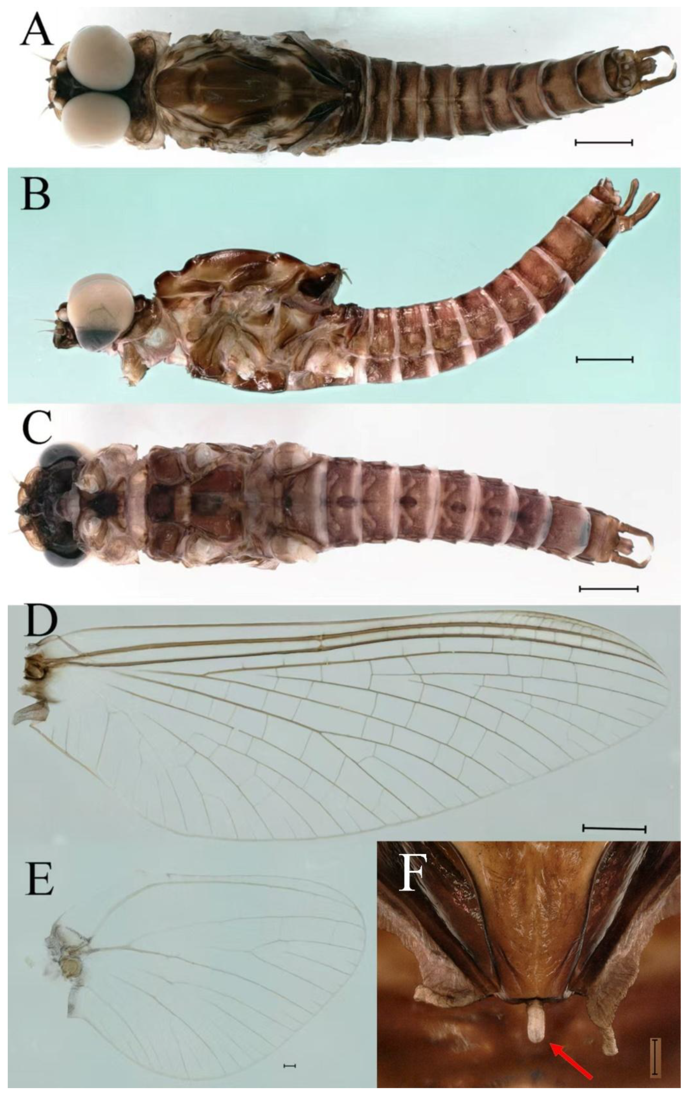 - Yang, K.; Li, X.F.; Tong, X.L.; Cai, Q.H. A new species of Siphlonurus Eaton, 1868 (Ephemeroptera, Siphlonuridae) from Yunnan, China. ZooKeys 2023, 1166, 121–139. [Google Scholar] [CrossRef]