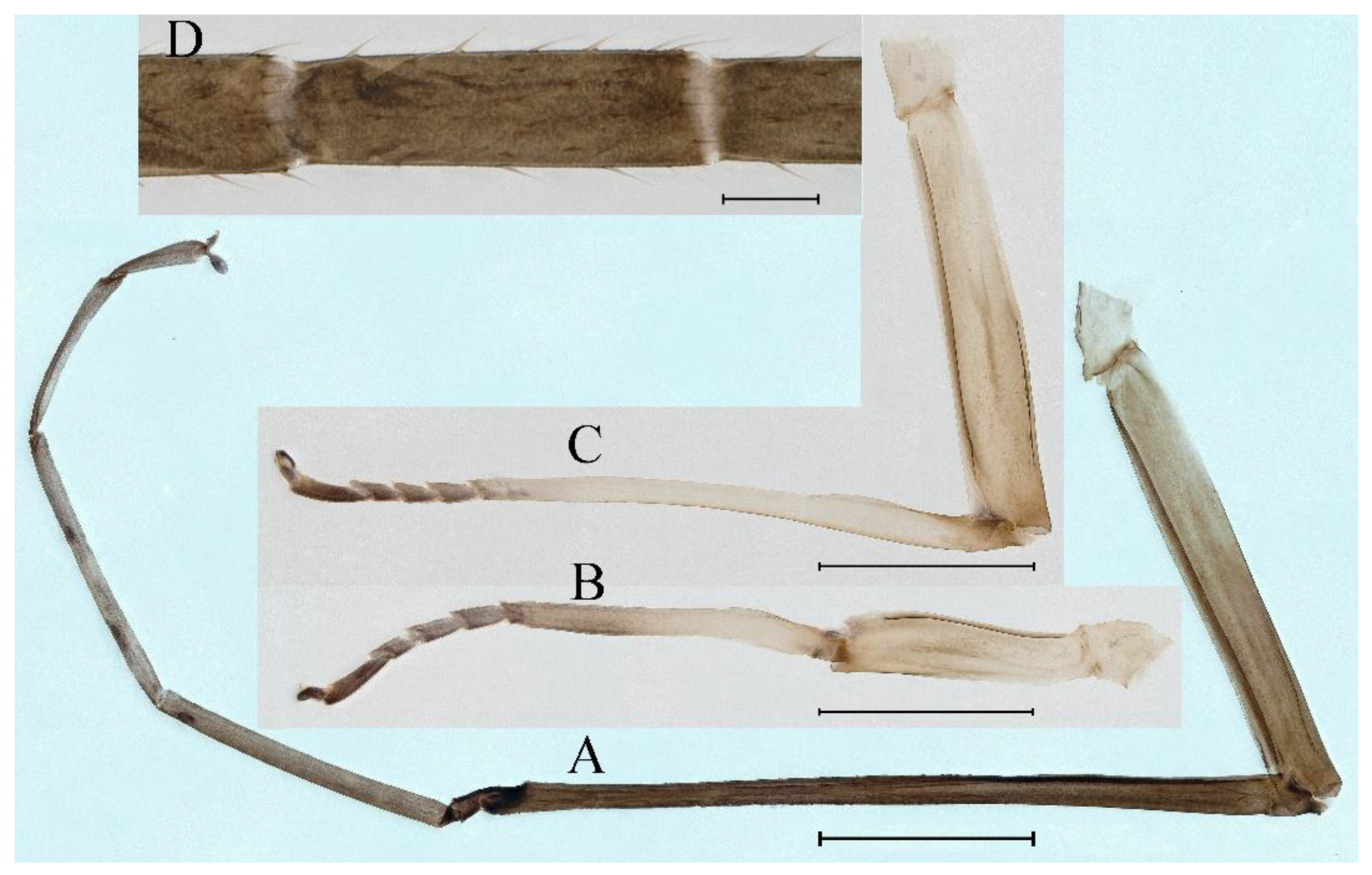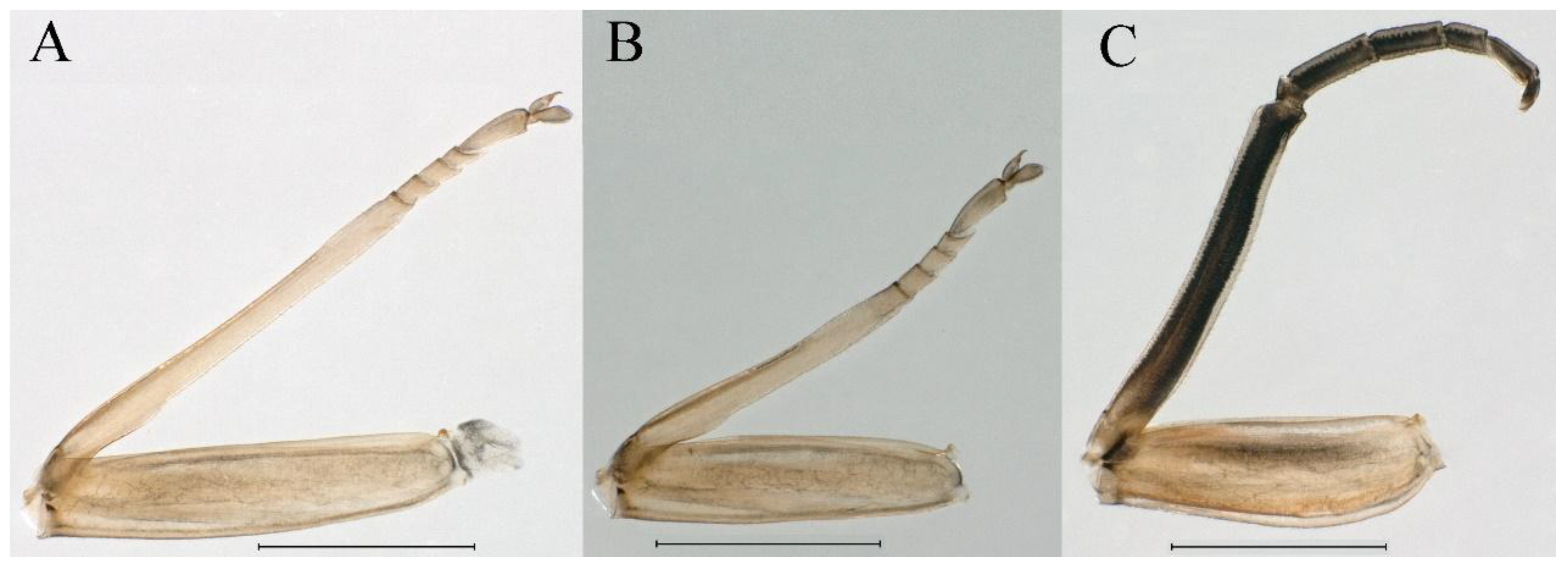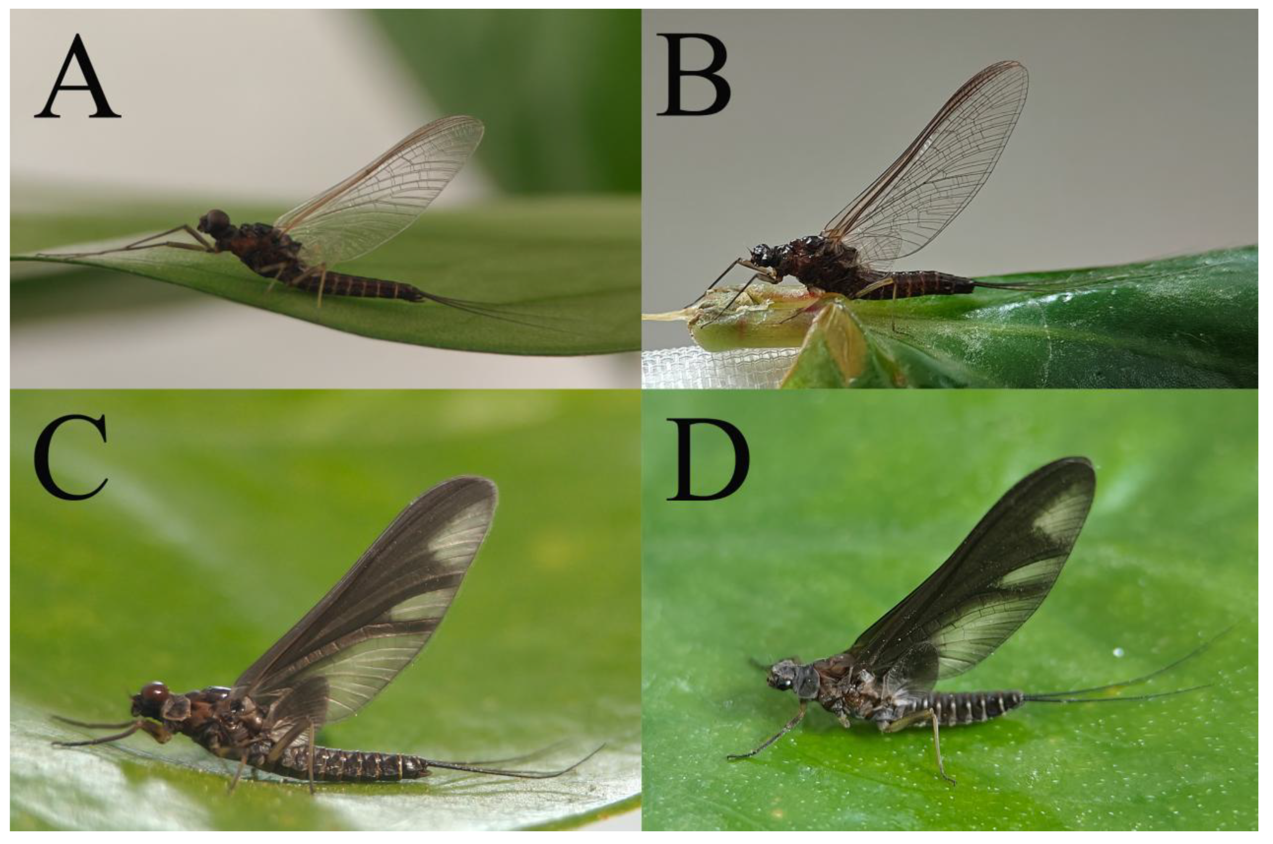 - Zheng, X.; Zhou, C. First detailed description of adults and nymph of Cincticostella femorata (Tshernova, 1972) (Ephemeroptera: Ephemerellidae). Aquat. Insects 2021, 42, 23–36. [Google Scholar] [CrossRef]