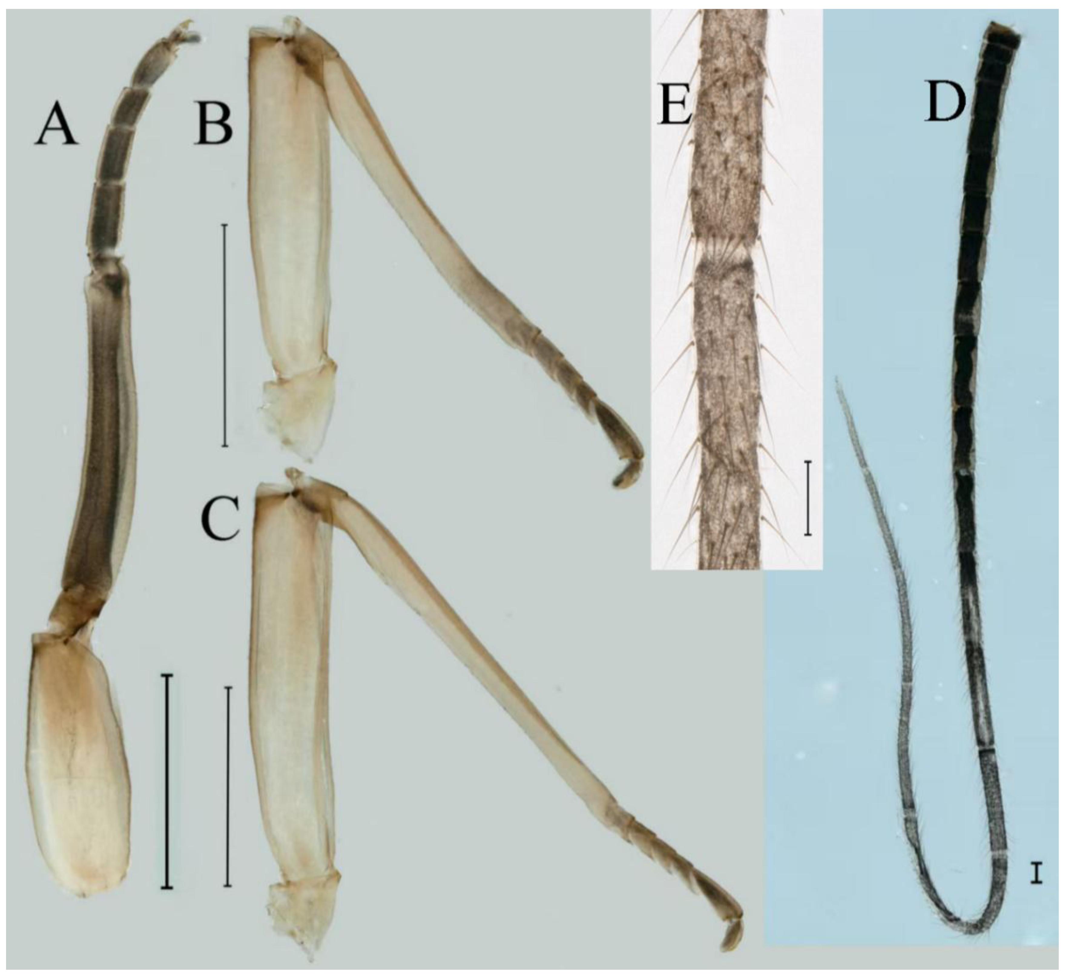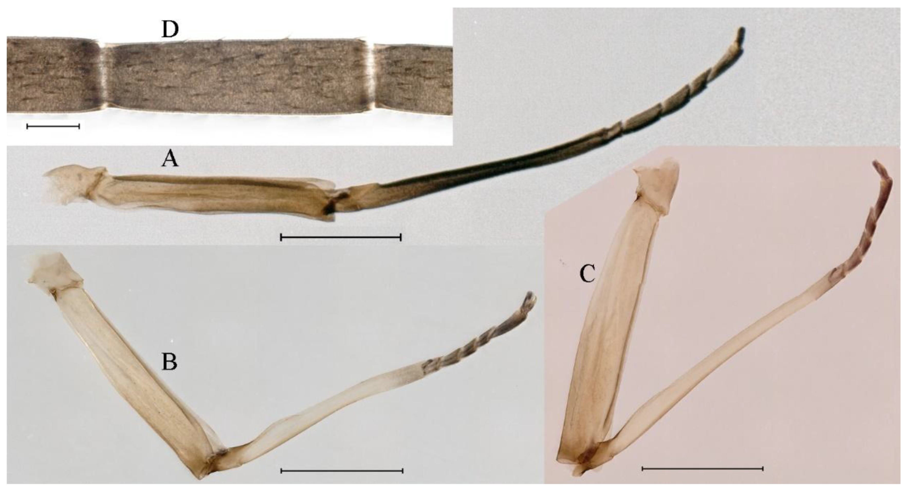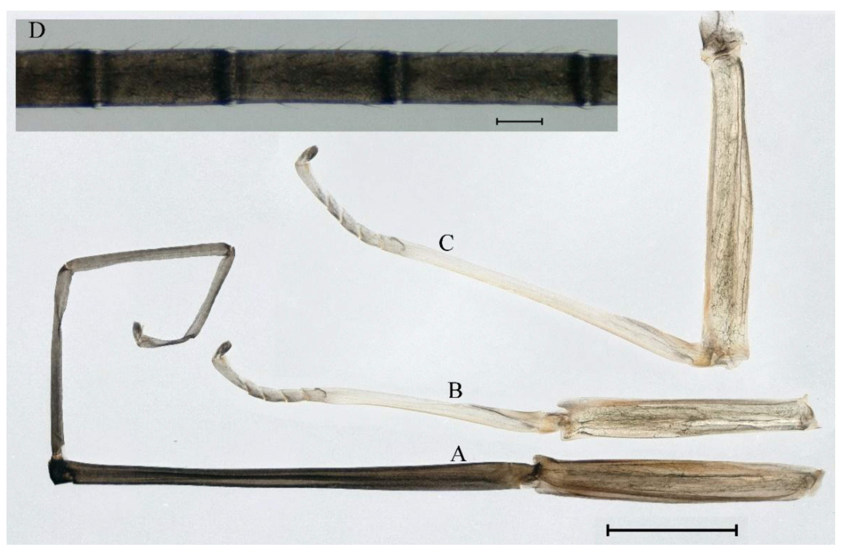 - Zheng, X.; Zhou, C. First detailed description of adults and nymph of Cincticostella femorata (Tshernova, 1972) (Ephemeroptera: Ephemerellidae). Aquat. Insects 2021, 42, 23–36. [Google Scholar] [CrossRef]