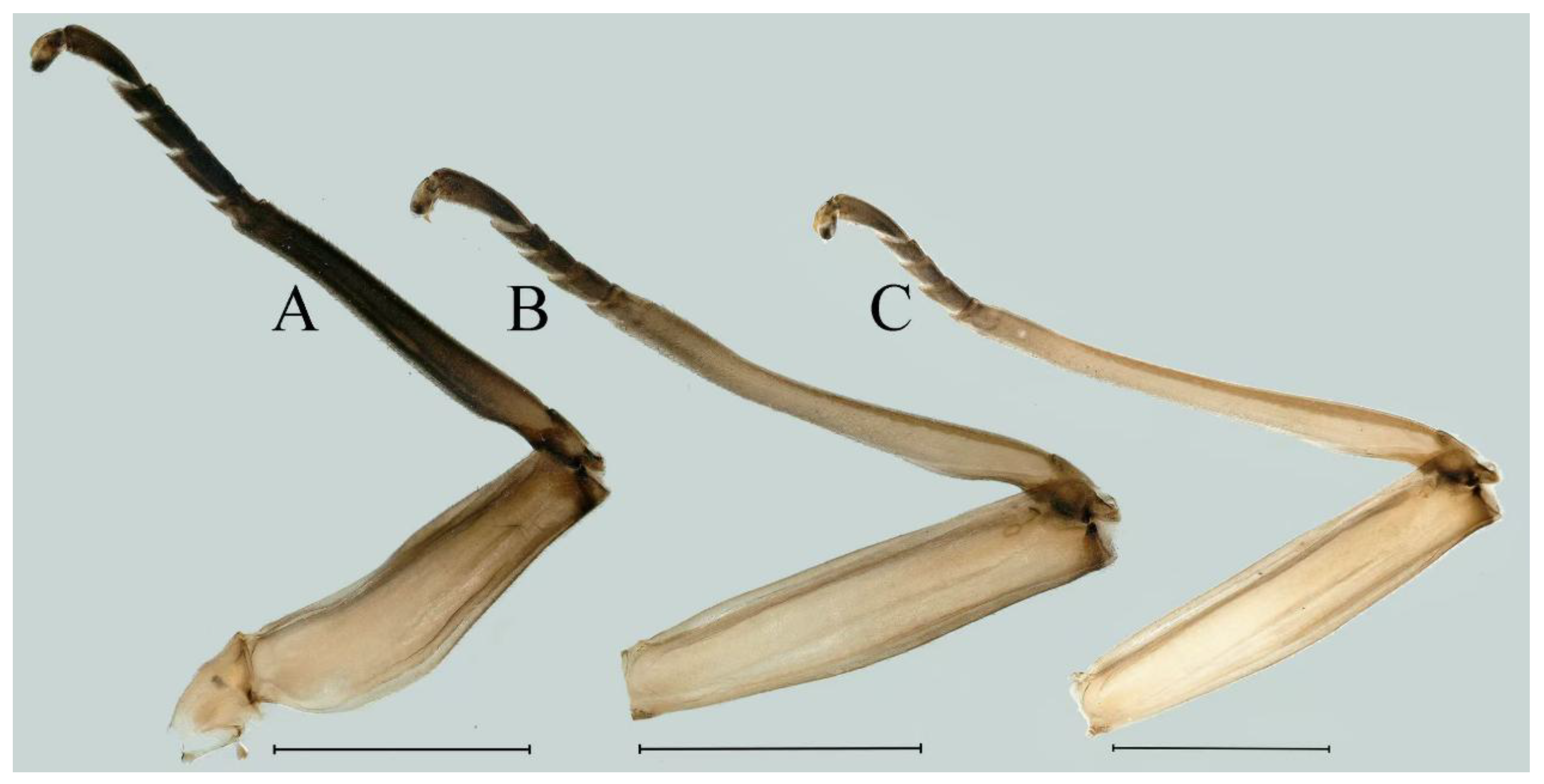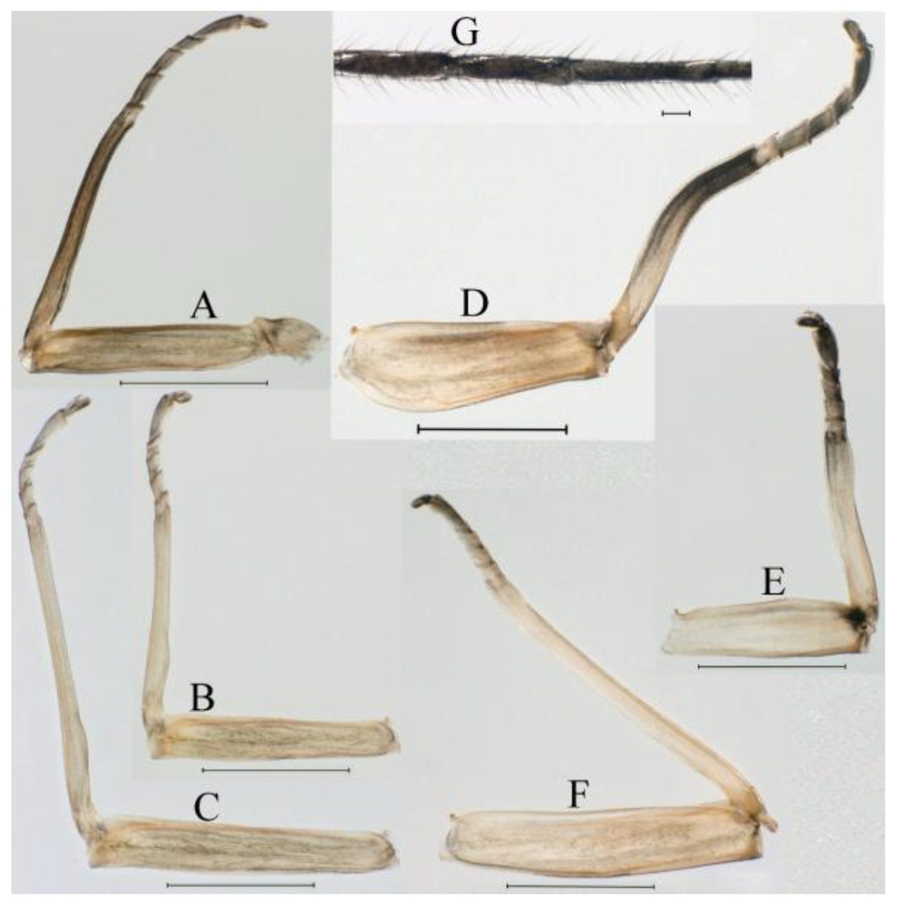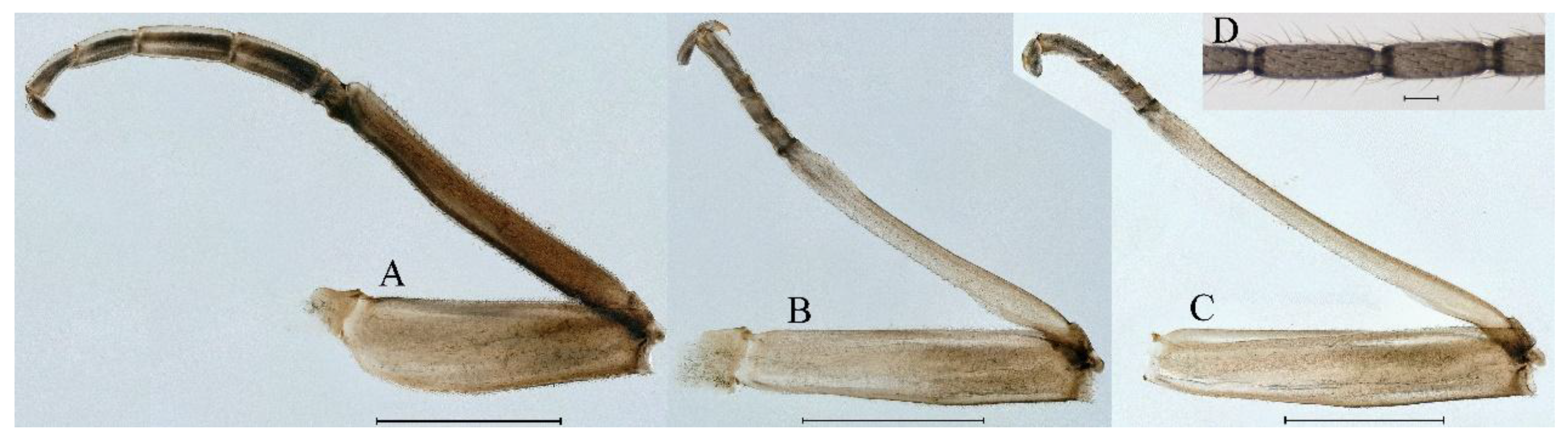 | 8 | Stout setae on dorsal surface of middle and hind femora | absent or up to several stout setae in basal area | surface with numerous stout setae | absent | surface with numerous stout setae |