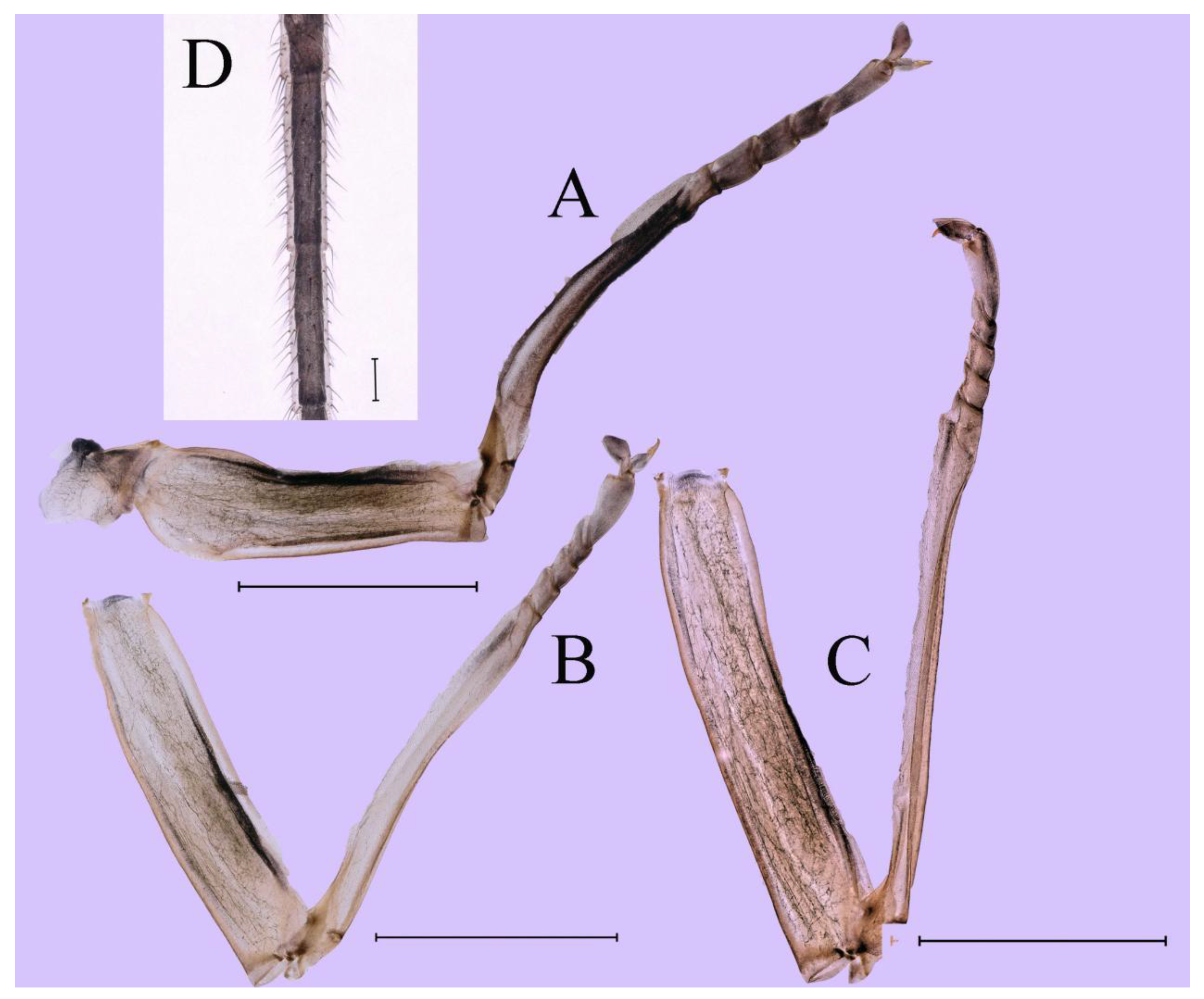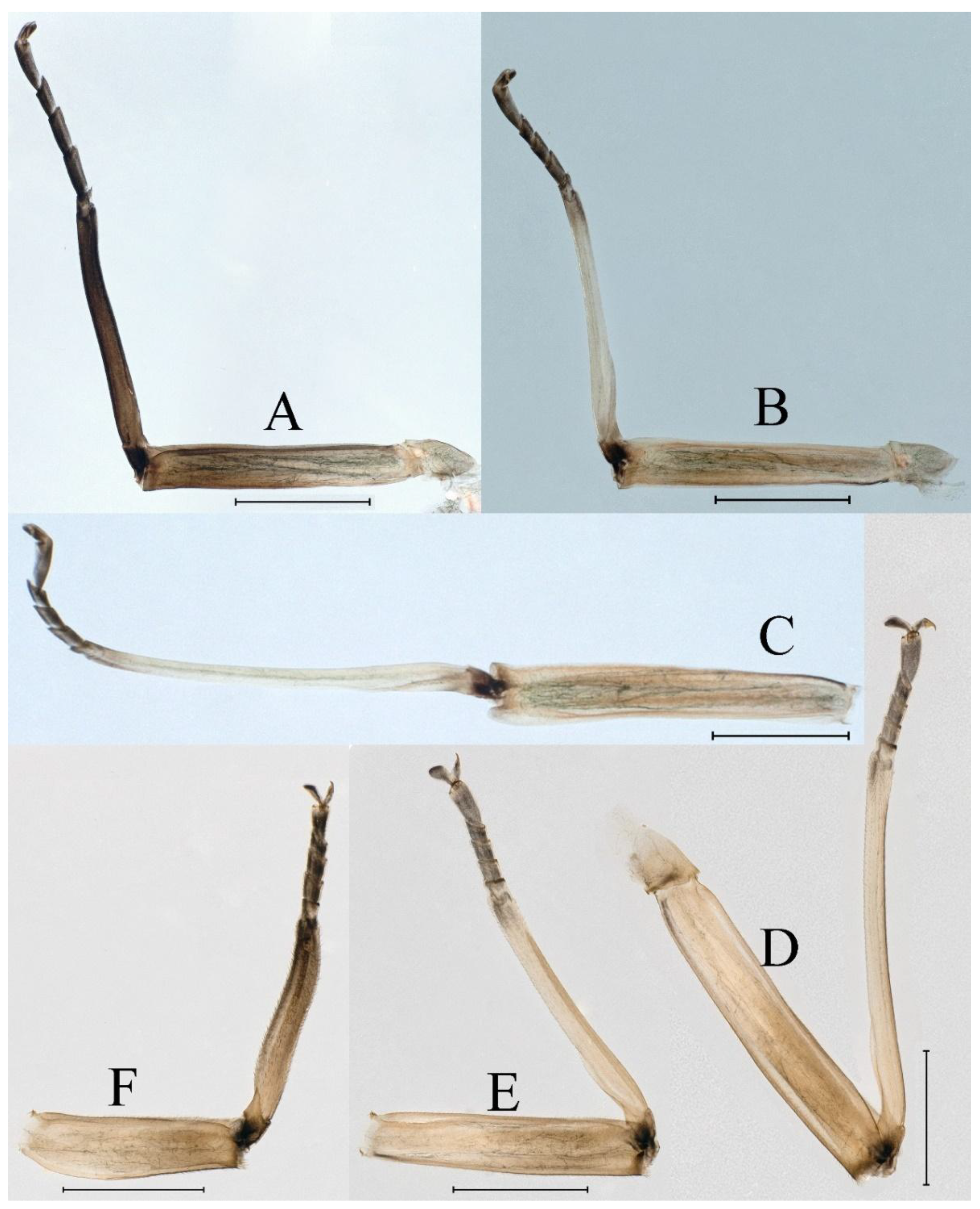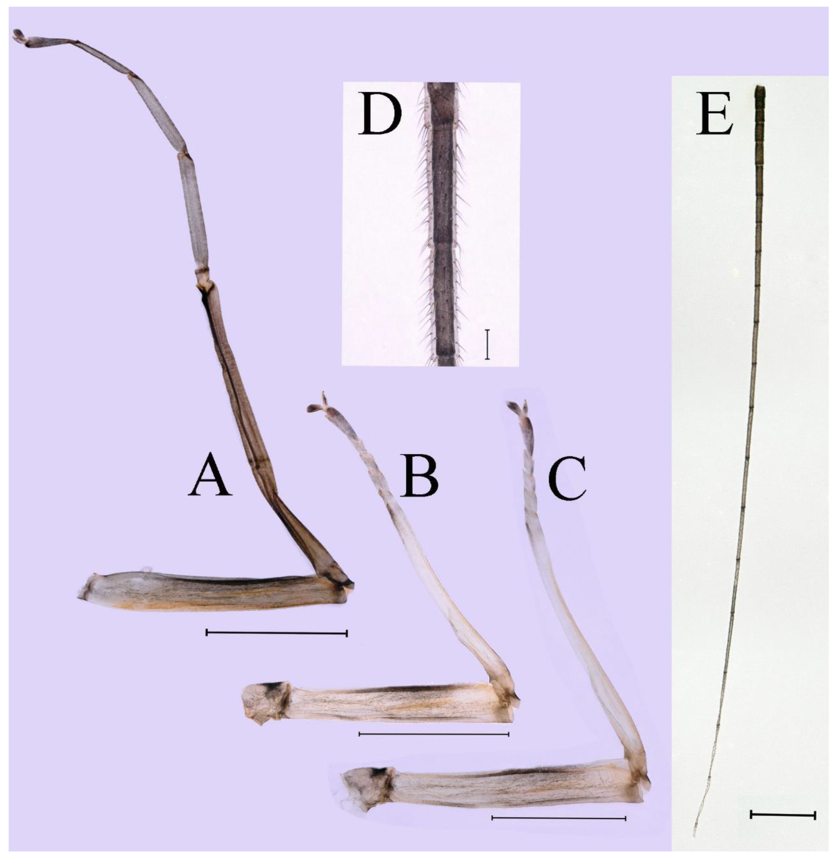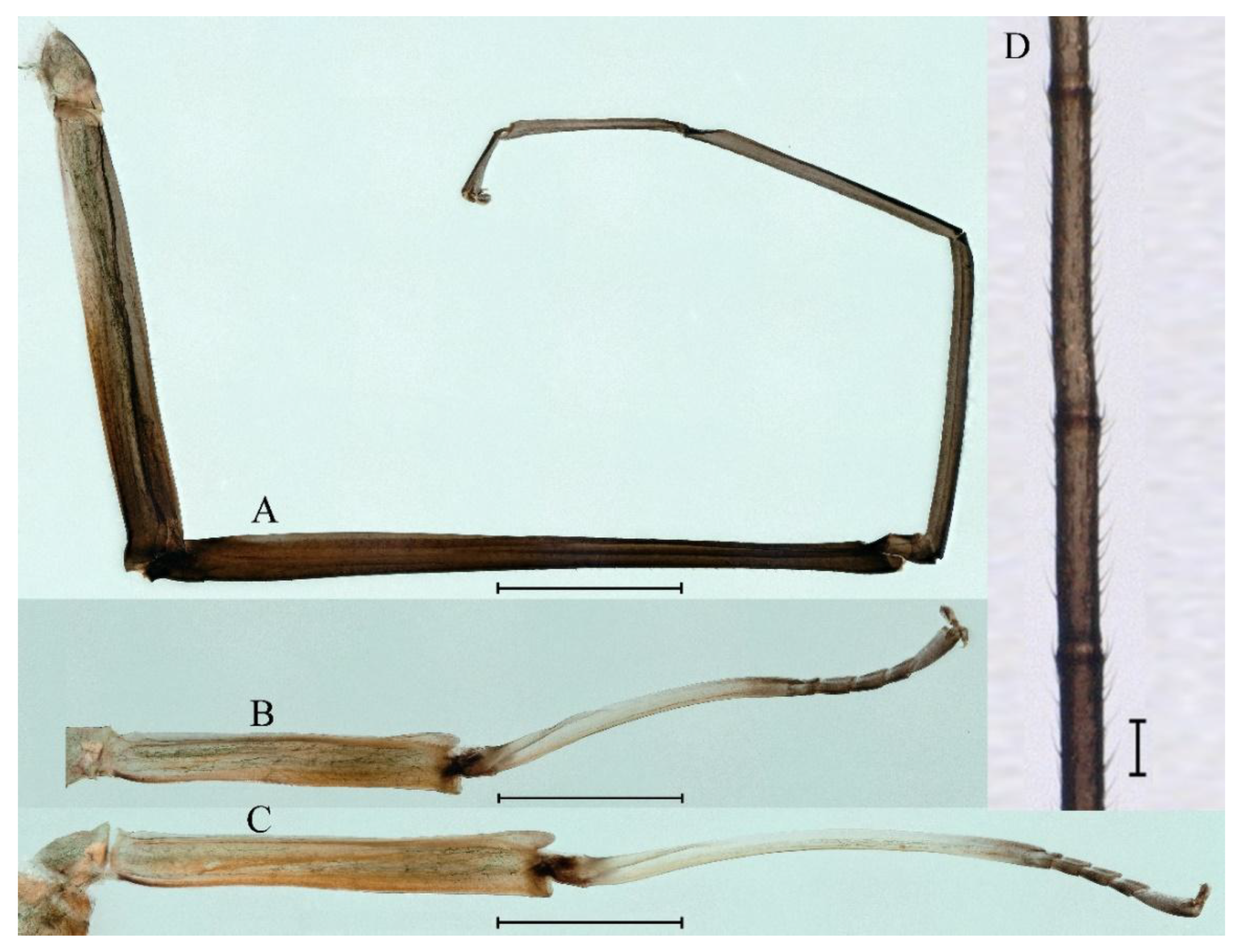| 8 | Stout setae on dorsal surface of middle and hind femora | absent or up to several stout setae in basal area | surface with numerous stout setae | absent | surface with numerous stout setae |