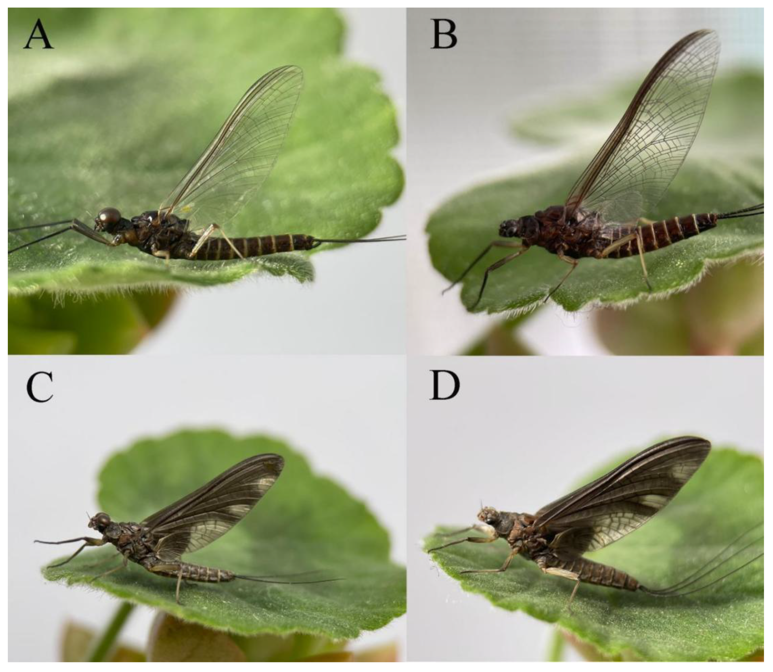 - Li, X.; Luo, Y.; Jiang, J.; Wang, L.; Tong, X. Description of a new species of the genus Ameletus Eaton, 1885 (Ephemeroptera, Ameletidae) from Yunnan, China. ZooKeys 2021, 1021, 37–51. [Google Scholar] [CrossRef]