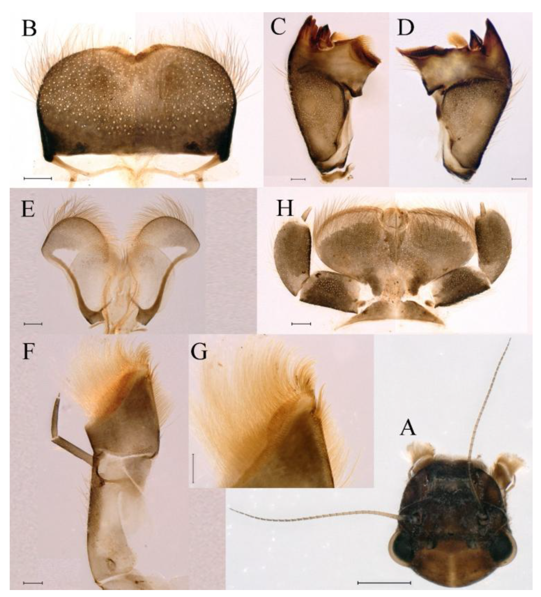 - 7′. Posteromedian projections on terga V–IX relatively well-developed (e.g., Figure 22A,B); eastern Palearctic and Indomalayan.................................................….......................................8