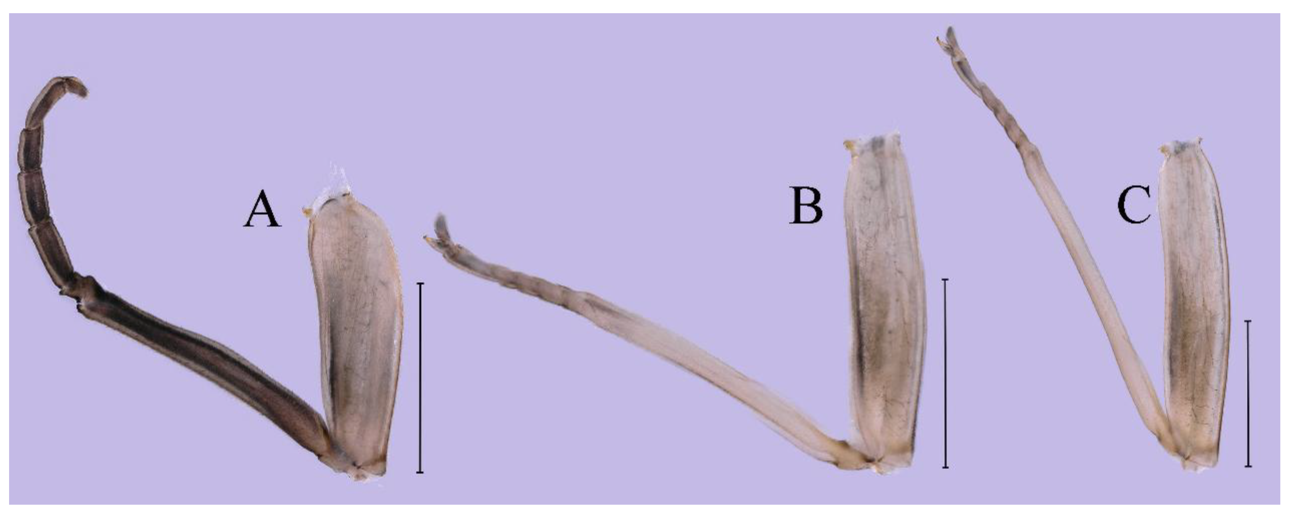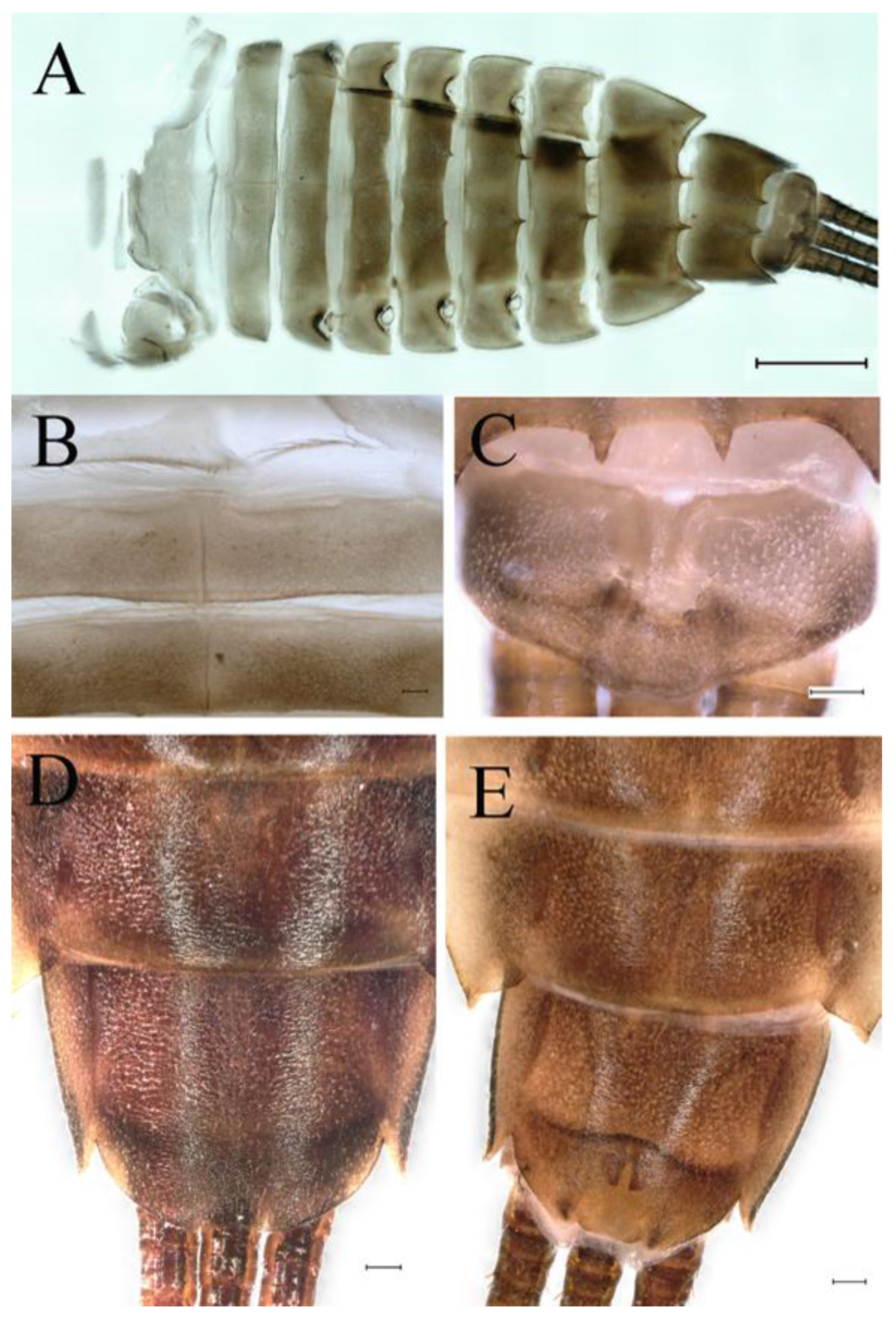 - Li, X.-F.; Sun, Y.-K.; Liu, Z.-Y.; Jacobus, L.M.; Xiao, W. A new species of Notacanthella Jacobus & McCafferty, 2008 (Ephemeroptera, Ephemerellidae) from Yunnan, China. ZooKeys 2022, 1103, 25–44. [Google Scholar] [CrossRef]