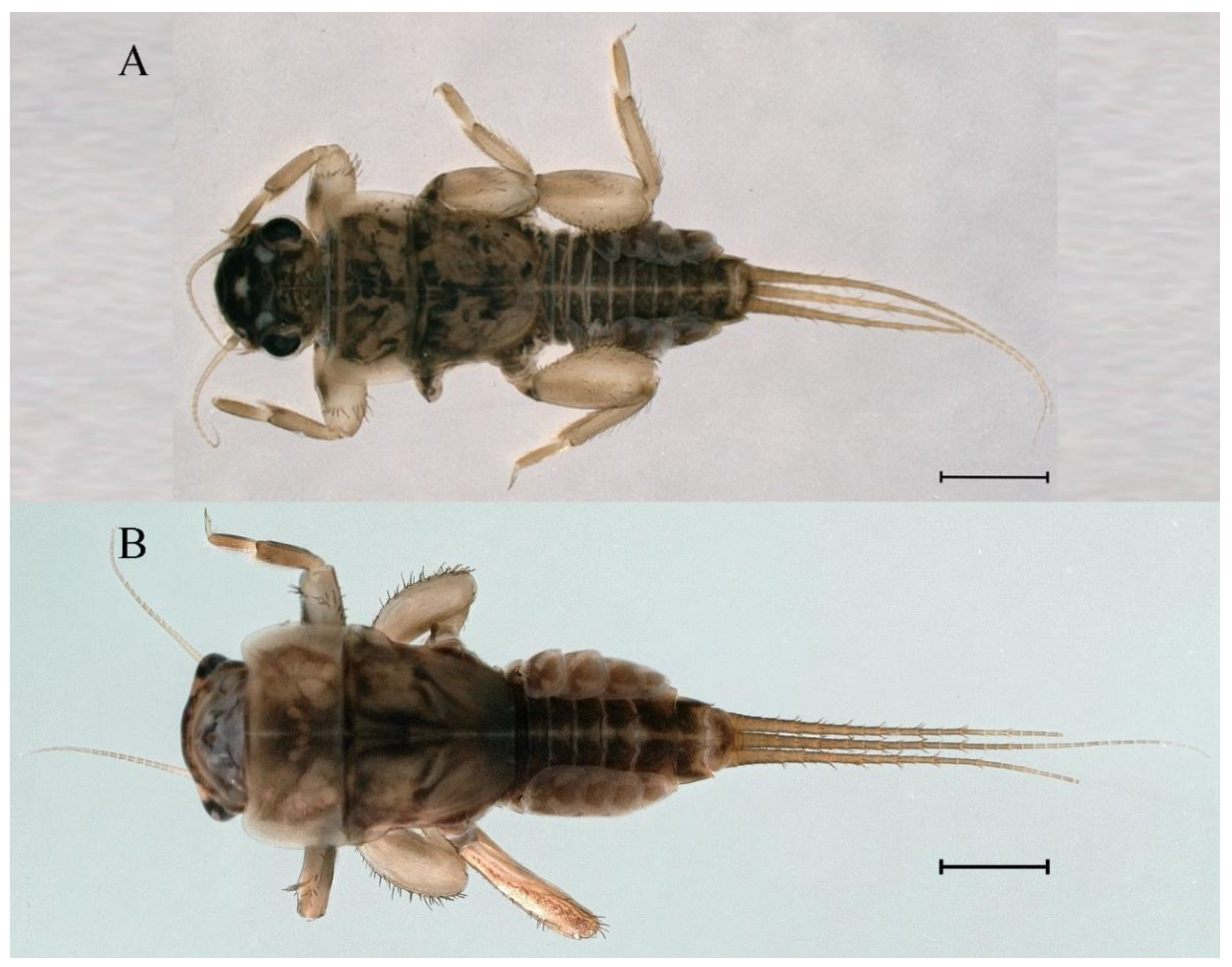 - Webb, J.M.; Jacobus, L.M.; Sullivan, S.P. The state of systematics of North American Baetis Leach, 1815 (Ephemeroptera: Baetidae), with recommendations for identification of larvae. Zootaxa 2018, 4394, 105–127. [Google Scholar] [CrossRef]