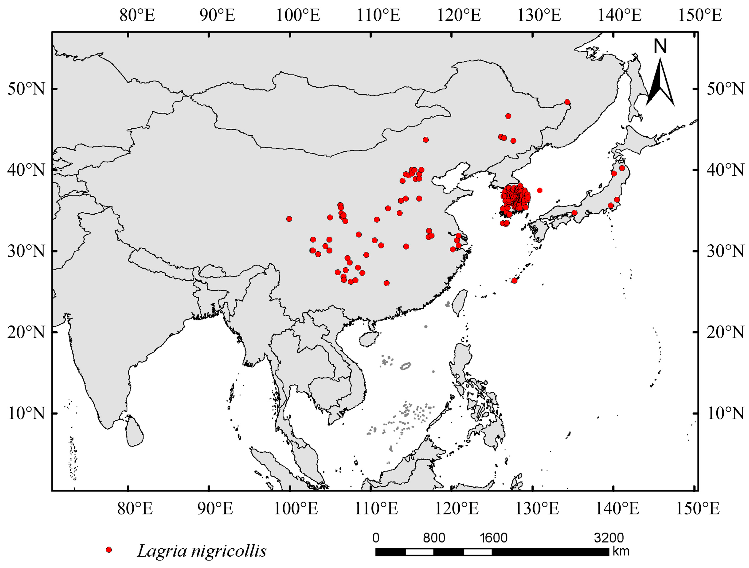 - Shi, A.M.; Pan, Y.S.; Li, Y.C. A redescription of Lagria nigricollis Hope, 1843 (Coleoptera: Tenebrionidae: Lagriini). Entomotaxonomia 2010, 32, 88–90. [Google Scholar]